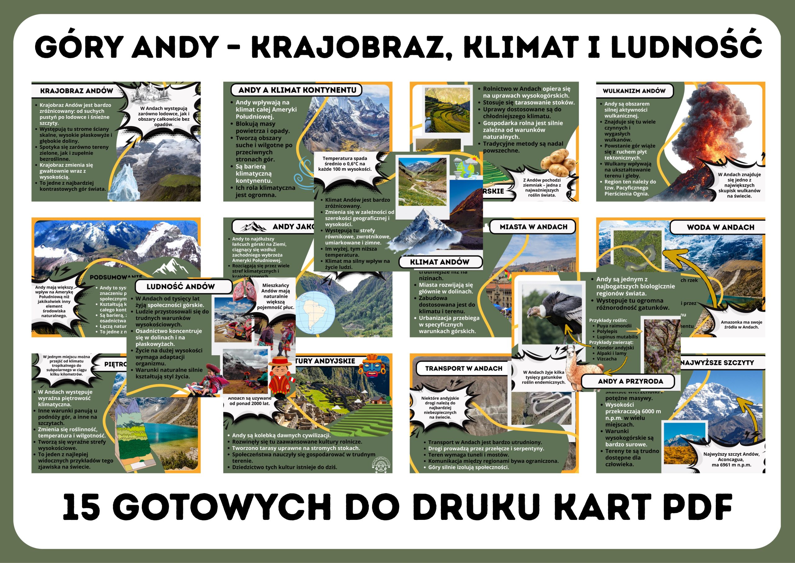 Gotowa gazetka szkolna o Andach to praktyczna pomoc dydaktyczna dla nauczyciela geografii podczas omawiania rzeźby terenu Ameryki Południowej. Materiał w przystępny i atrakcyjny sposób przybliża uczniom położenie Andów, ich powstanie, najwyższe szczyty, klimat oraz znaczenie przyrodnicze i gospodarcze.