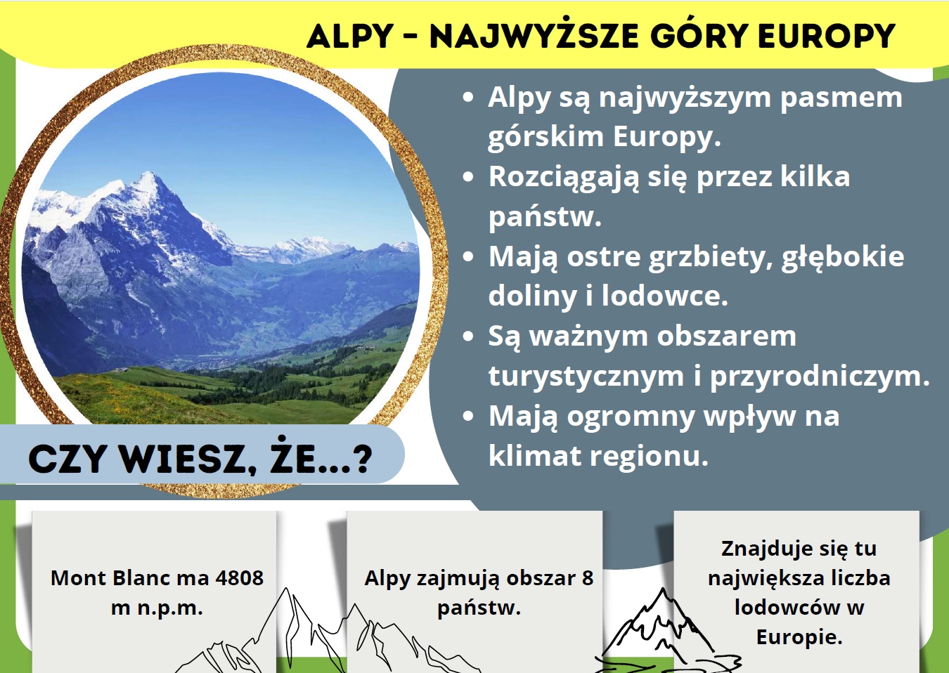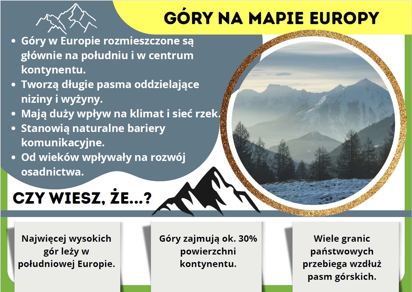 Góry Europy wpływają na klimat, rzeki, rolnictwo, turystykę i osadnictwo, dlatego są ważnym tematem na lekcjach geografii.