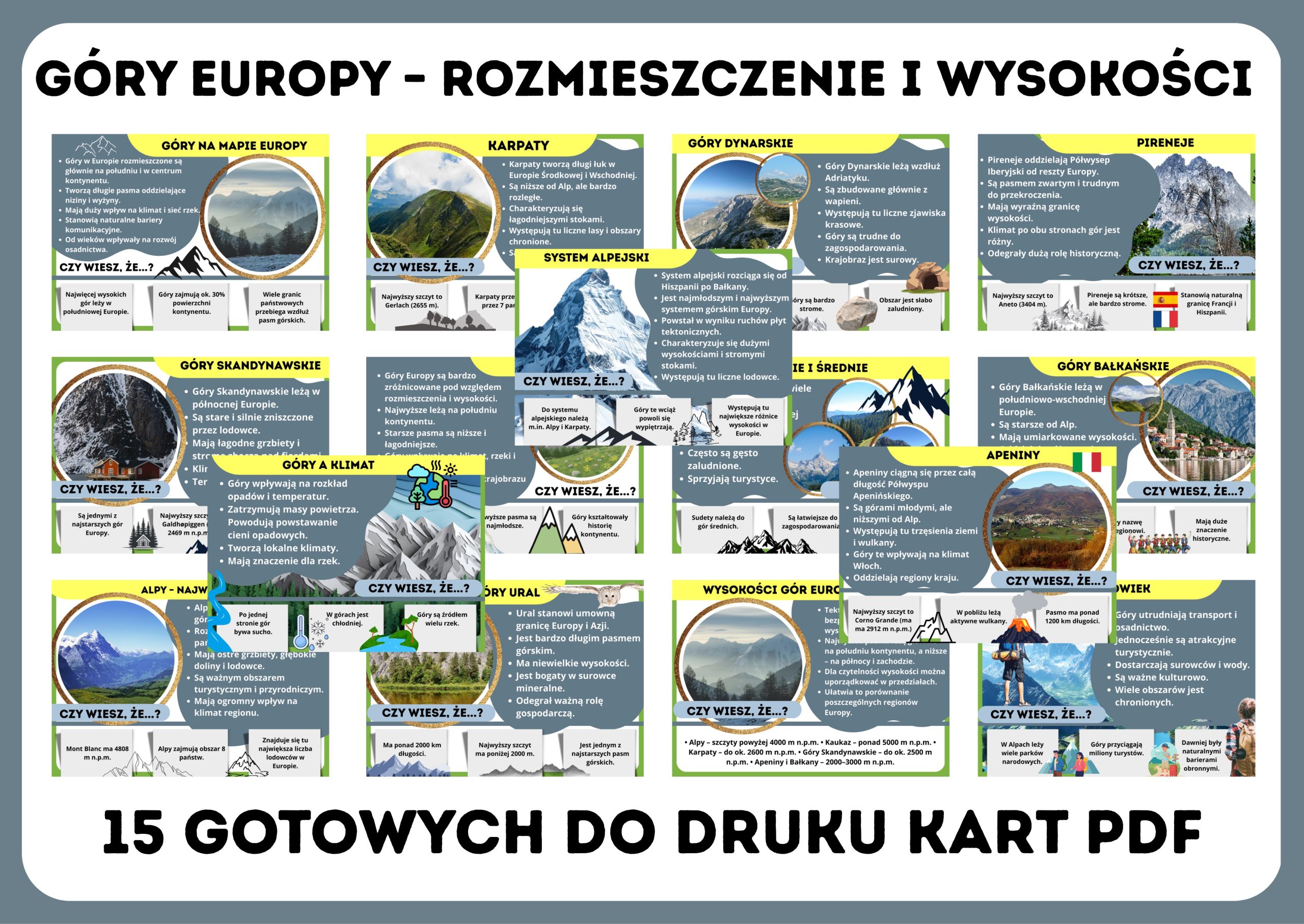 Uatrakcyjnij lekcje geografii i uporządkuj wiedzę uczniów! 🏔️ Gazetka szkolna „Góry Europy – rozmieszczenie i wysokości” to aż 15 kart PDF gotowych do druku, które w czytelny i wizualny sposób prezentują najważniejsze pasma górskie naszego kontynentu.