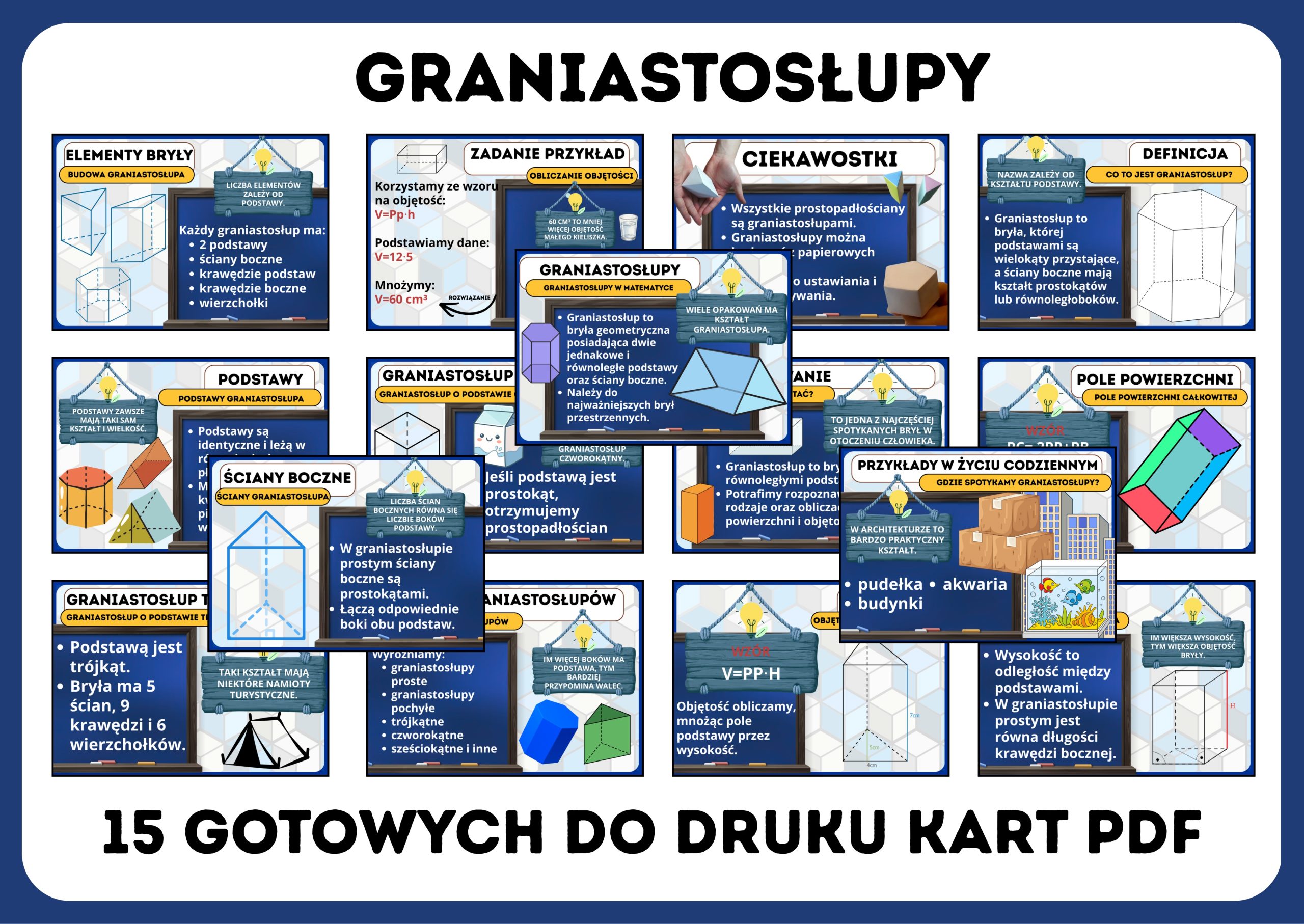 Przygotuj atrakcyjną gazetkę szkolną o graniastosłupach i pomóż uczniom lepiej zrozumieć jedne z najważniejszych brył geometrycznych! Zestaw zawiera aż 15 kart PDF, które w przejrzysty i ciekawy sposób wyjaśniają, czym są graniastosłupy, jakie mają elementy oraz jak obliczać ich pole powierzchni i objętość.