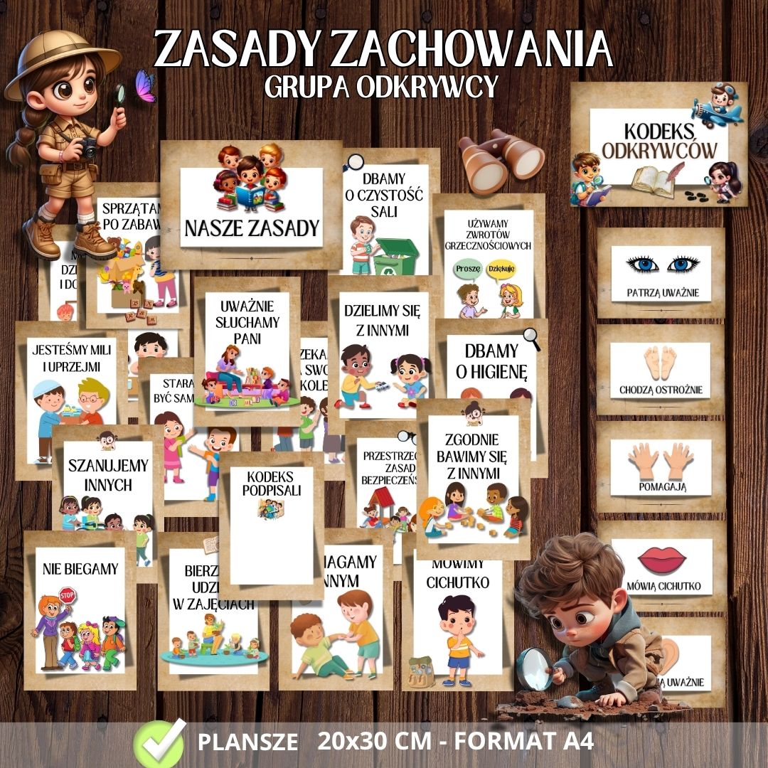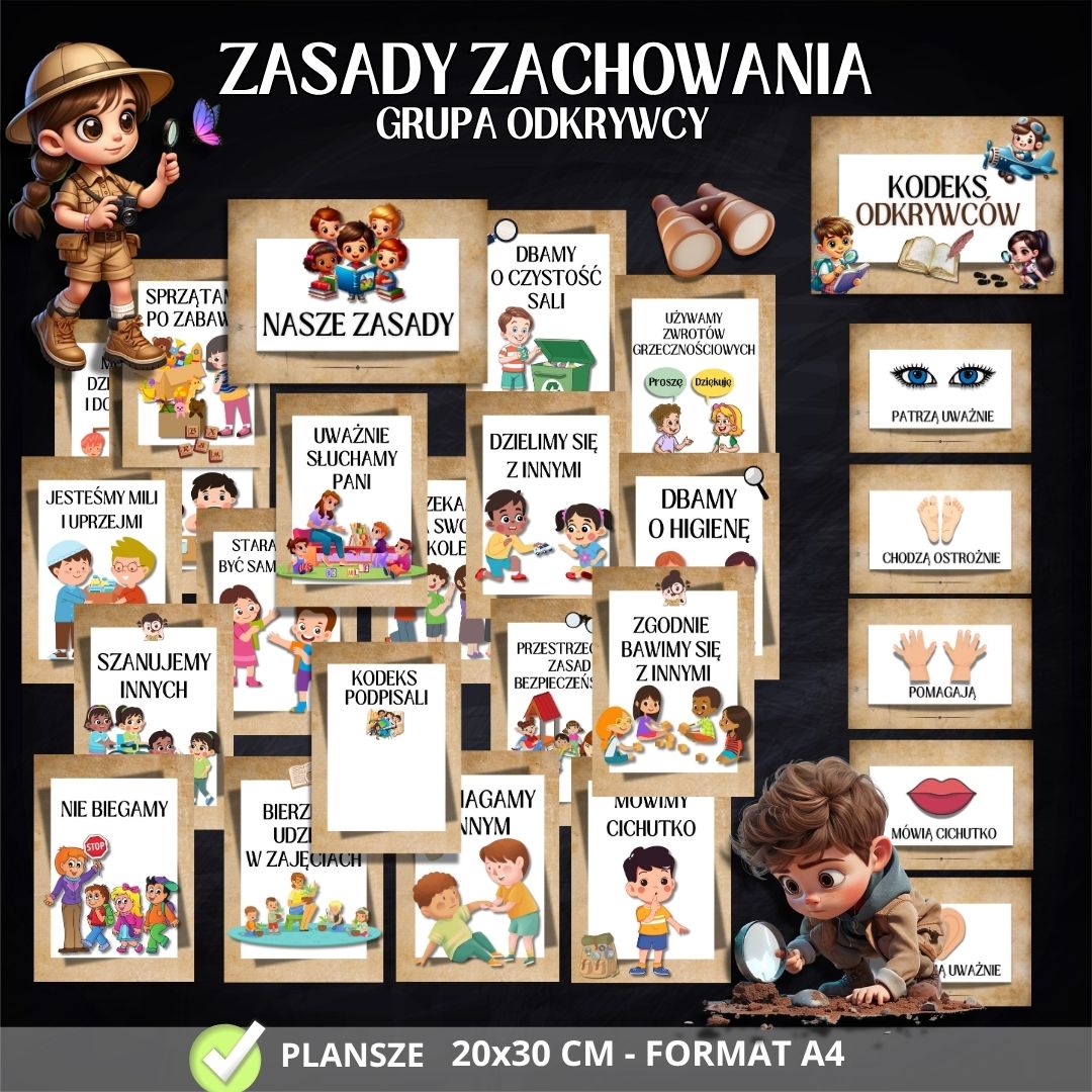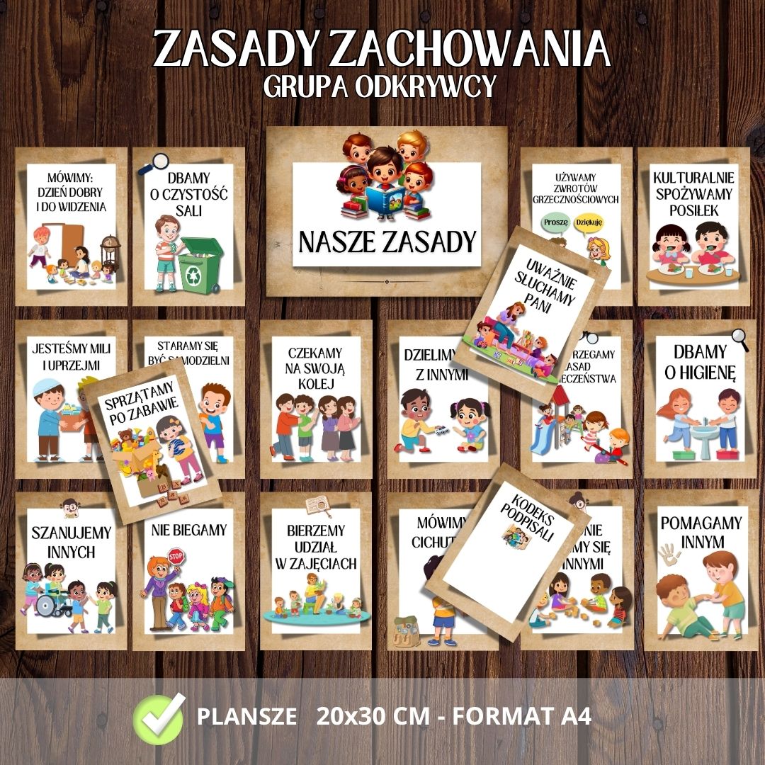 📘 W skład zestawu wchodzą dwa komplety plansz (zasady i kodeks). 📂 Plik PDF – gotowy do druku. Drukuj dowolną liczbę razy – plansze sprawdzą się jako ozdoba sali, materiał do zajęć wychowawczych, element kącika zasad lub gazetki tematycznej.