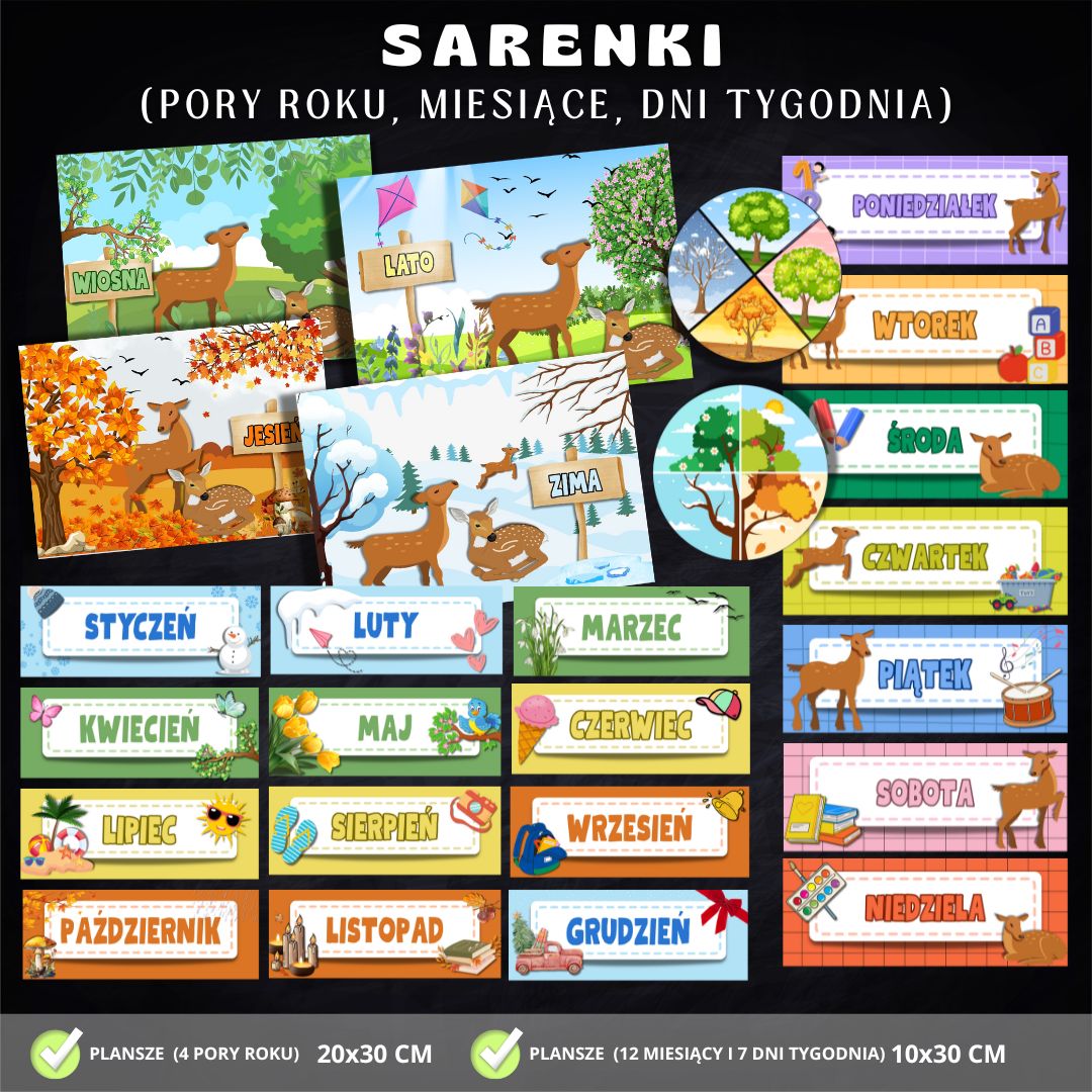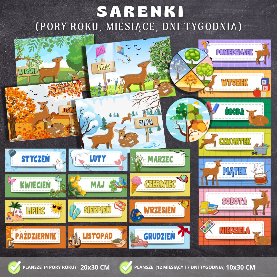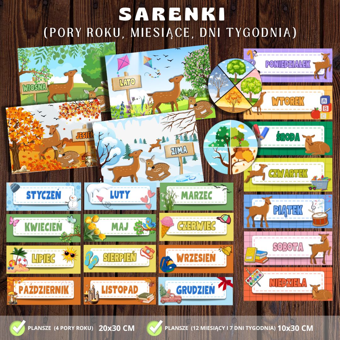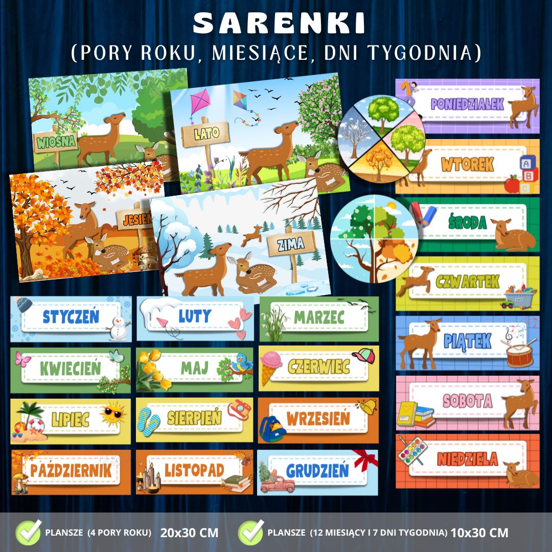 • 4 plansze z porami roku (z uwzględnieniem grafik przedstawiających SARENKI na tle poszczególnych krajobrazów) – 20 × 30 cm,