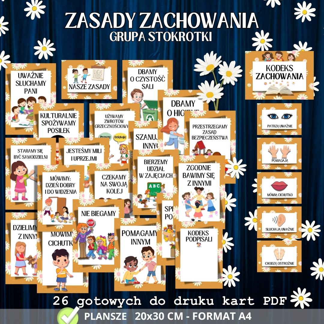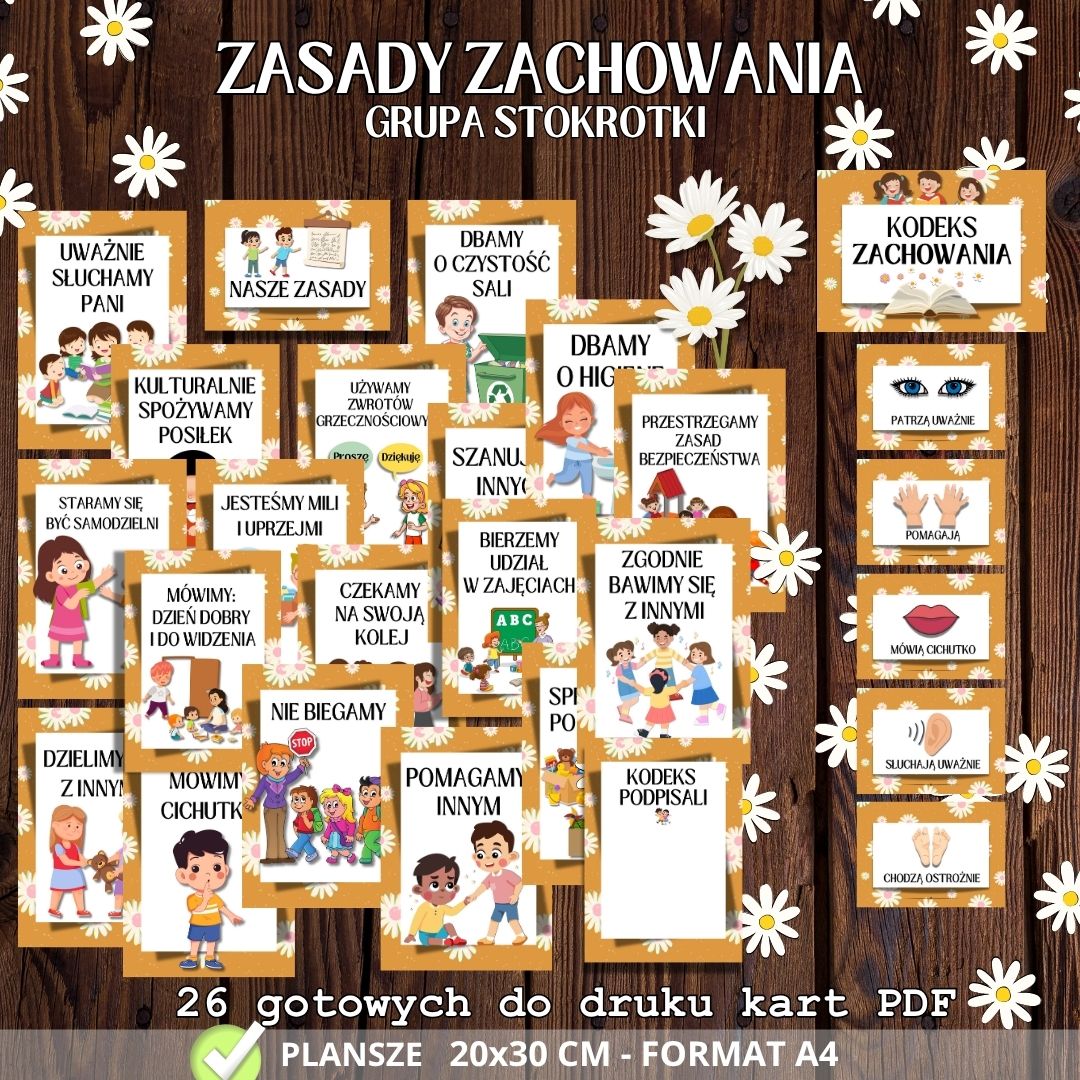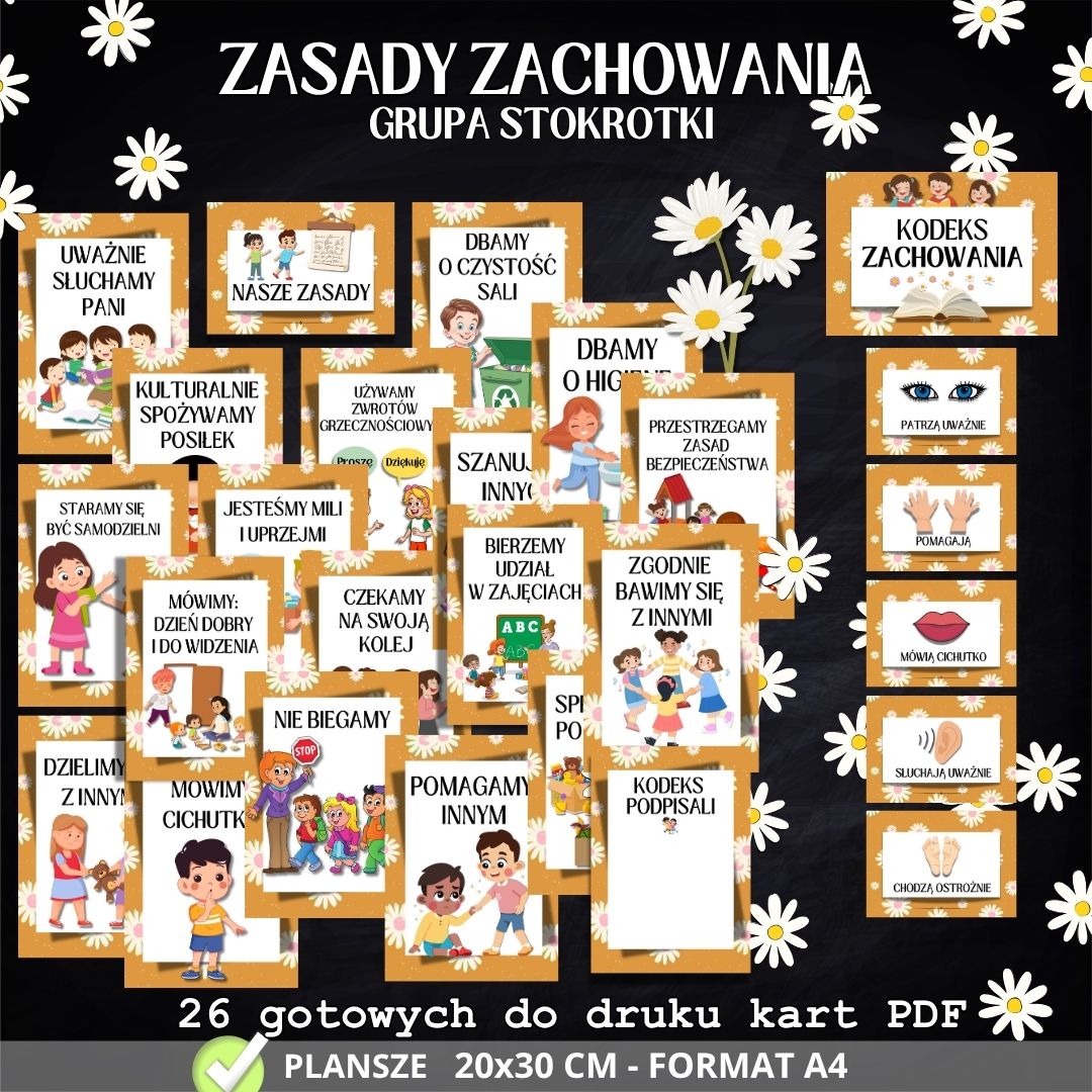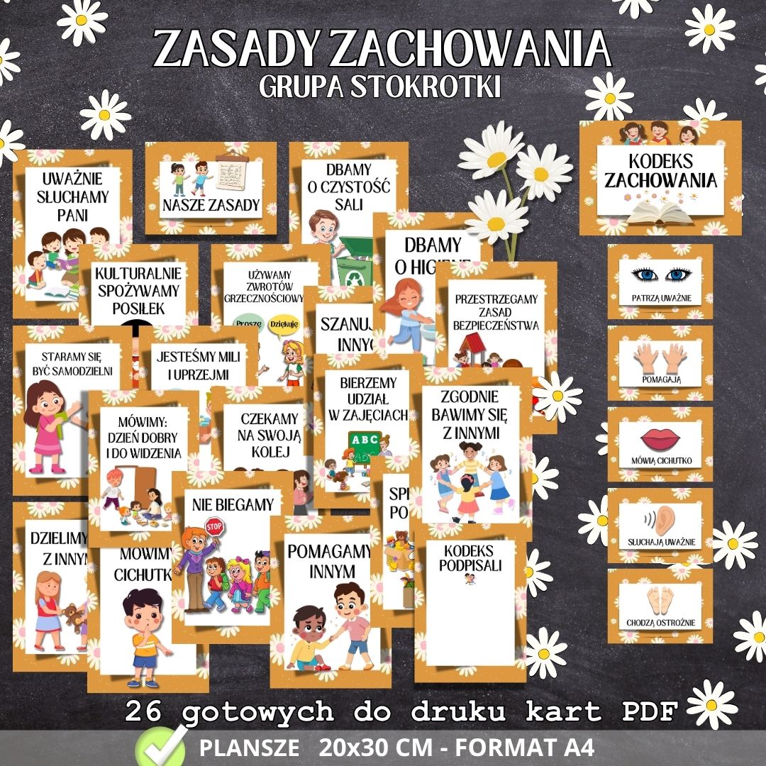 🌼 Kodeks STOKROTEK – 26 edukacyjnych plansz 🌼 Grupa Stokrotki to dzieci delikatne, radosne i pełne uroku – zasługują na spokojną przestrzeń pełną zrozumiałych zasad i dobrej atmosfery. 🌼 Kodeks Stokrotek to zestaw 26 kolorowych plansz, które pomagają dzieciom uczyć się zasad, współpracy i wzajemnego szacunku.