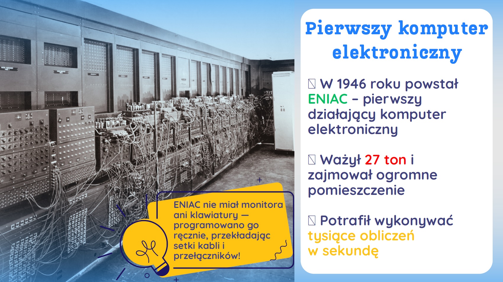 💡 1. Zrozumienie współczesnego świata – Komputery są dziś wszędzie – w telefonach, samochodach, sklepach i szpitalach (także w naszych szkołach). Znajomość ich historii pomaga zrozumieć, jak doszliśmy do dzisiejszej ery cyfrowej i dlaczego technologia odgrywa tak ważną rolę w naszym życiu.