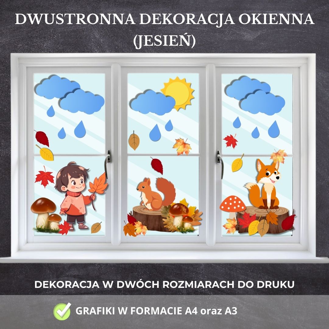 🍂 Dwustronna jesienna dekoracja na okno 🍂 Odmień okna w przedszkolu lub klasie dzięki dwustronnej dekoracji jesiennej – pełnej barwnych liści, grzybków, leśnych zwierząt i wesołych motywów pogodowych.
