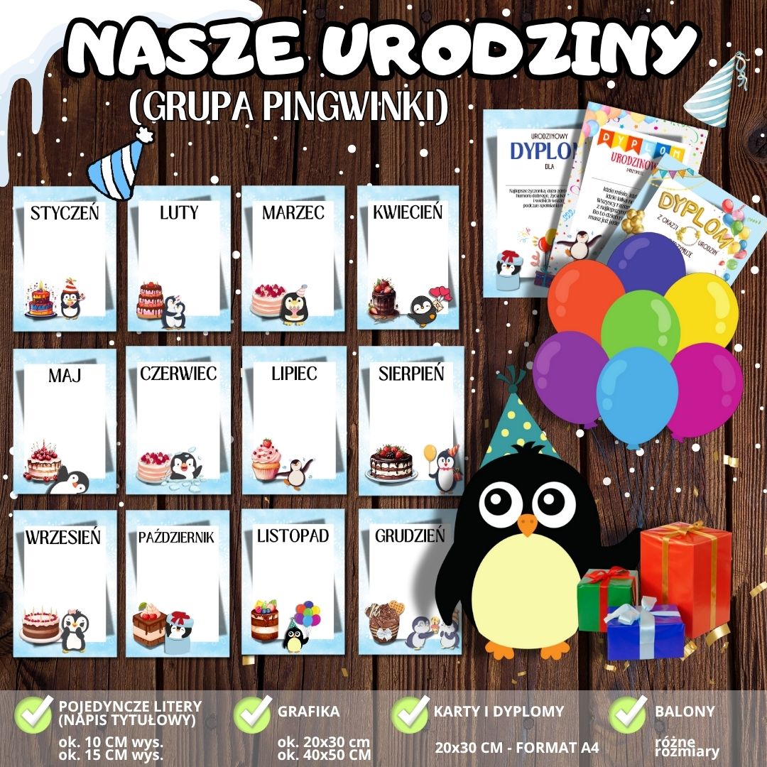 🐧 Urodziny w grupie „Pingwinki” to gorące świętowanie! 🎂🎉 W grupie „Pingwinki” każdy urodzinowy dzień to wyjątkowy moment pełen radości, śmiechu i dziecięcych emocji. Dzięki zestawowi „NASZE URODZINY” z motywem uroczego pingwinka z prezentami, z łatwością przygotujesz piękną i spójną dekorację, która rozgrzeje serca wszystkich małych solenizantów!