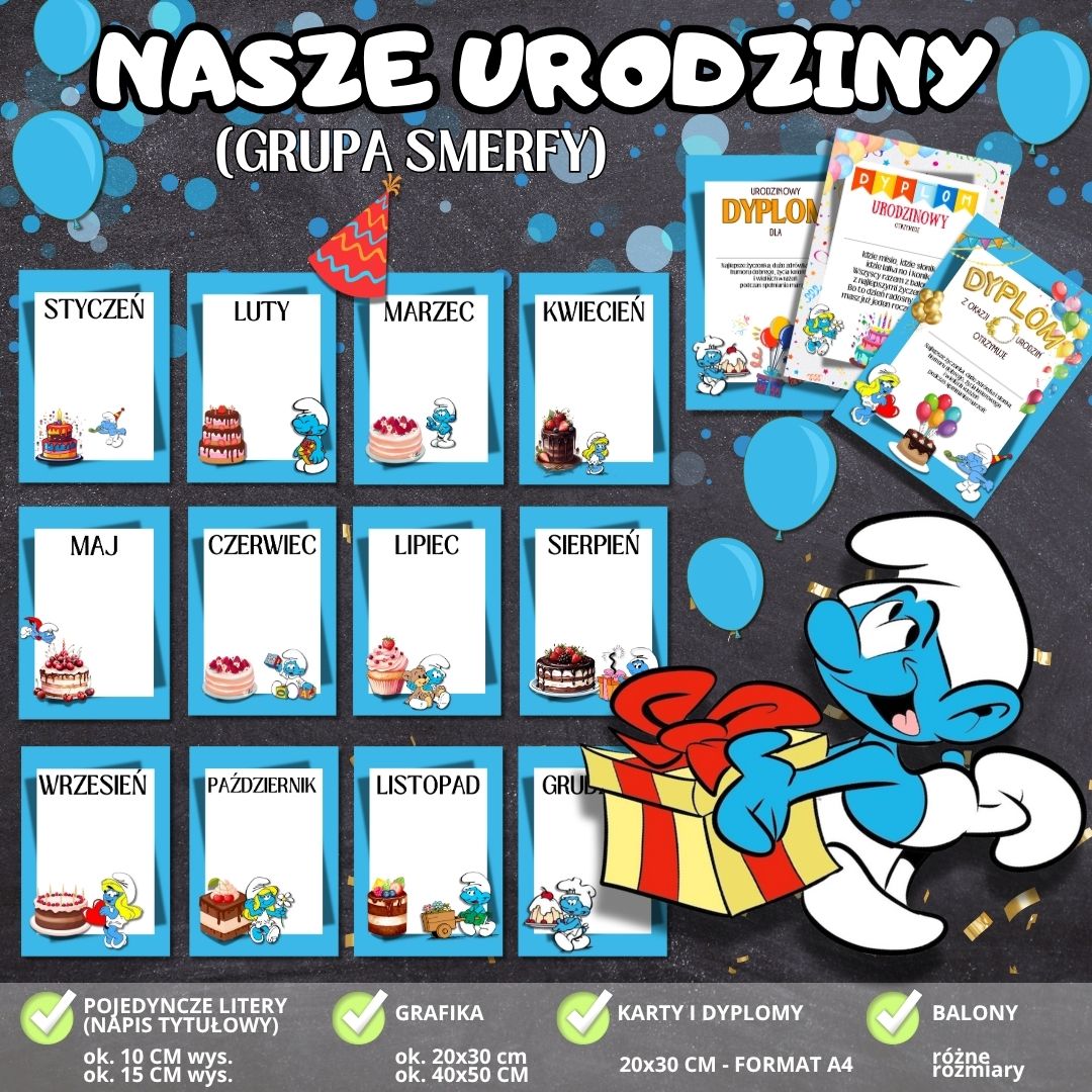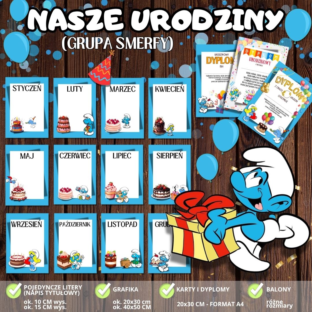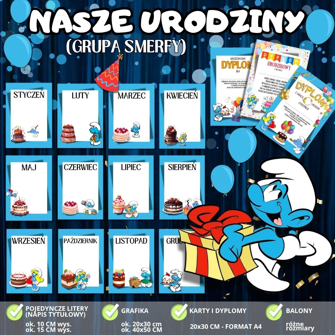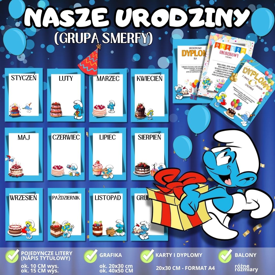 🧁 Wszystko utrzymane w jednej, spójnej stylistyce – zestaw doskonale pasuje do innych materiałów z serii GRUPA SMERFY, tworząc estetyczną i przyjazną przestrzeń w sali. 📄 Plik w formacie PDF – gotowy do natychmiastowego pobrania i druku, co oszczędza Twój czas i pozwala szybko przygotować salę do świętowania. Z zestawem „NASZE URODZINY” każde urodziny w grupie „Smerfy” staną się niezapomnianym przeżyciem – kolorowym, radosnym i pełnym magii!