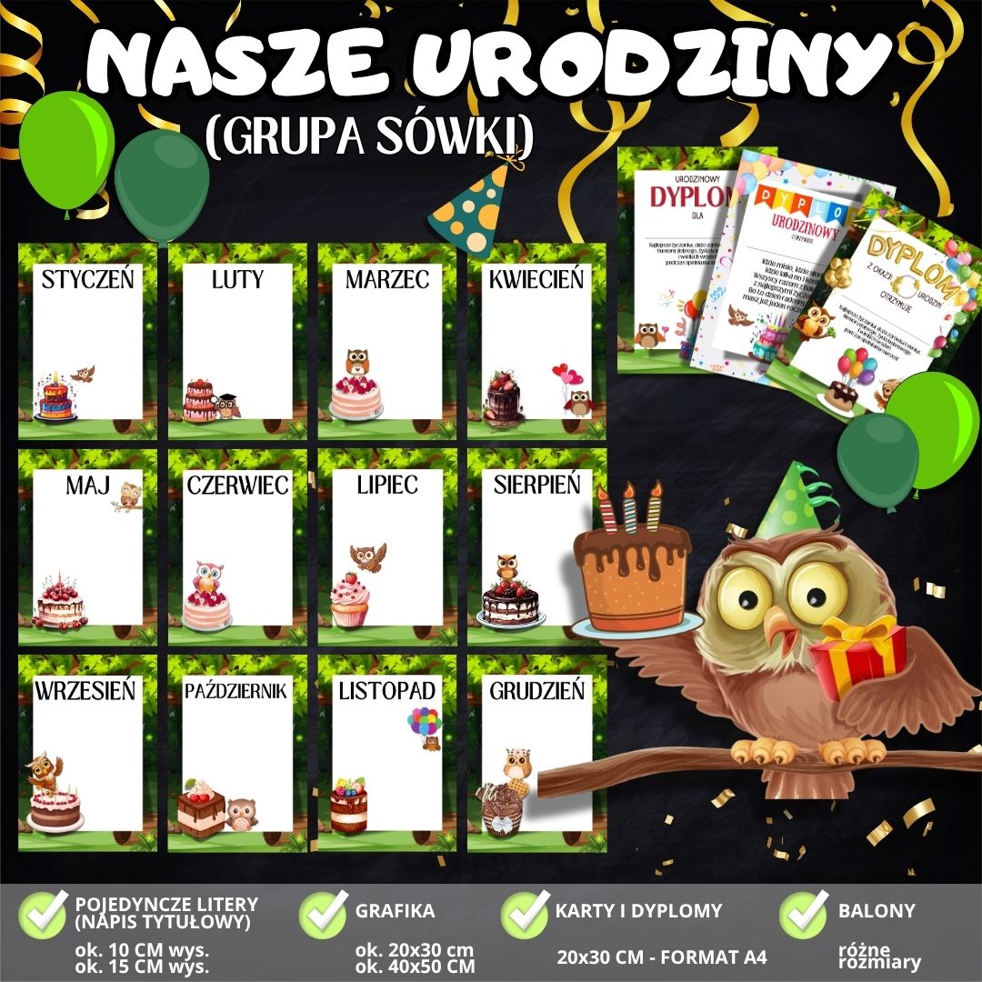 W grupie „Sówki” każde urodziny to wyjątkowa chwila, pełna uśmiechów, życzeń i wspólnego świętowania. Dzięki zestawowi „NASZE URODZINY” z motywem sowy trzymającej tort przygotujesz piękną, gotową dekorację, która uczyni ten dzień jeszcze bardziej wyjątkowym!