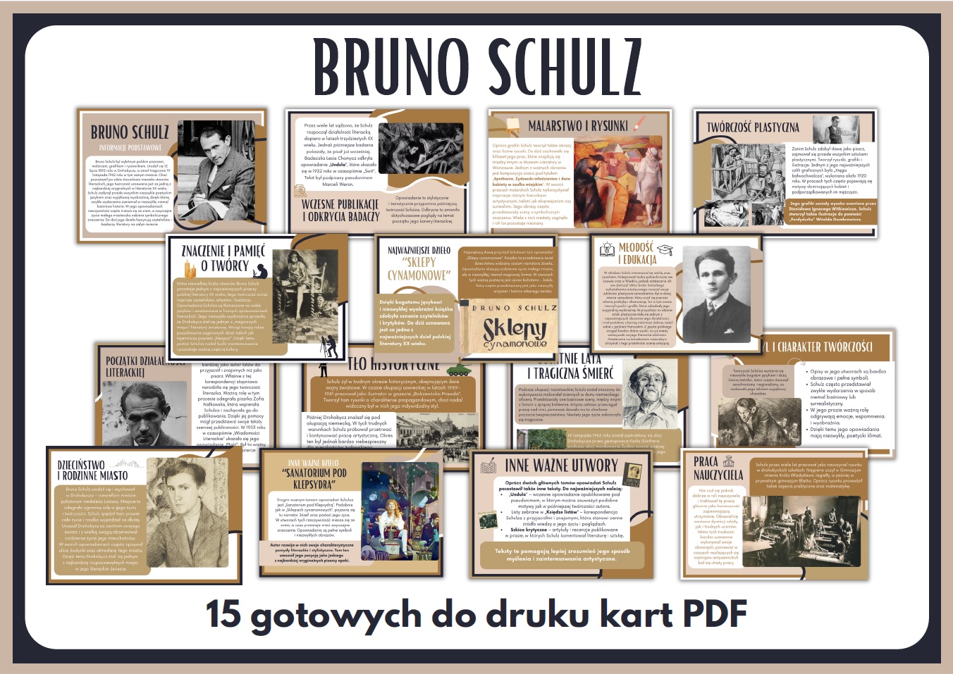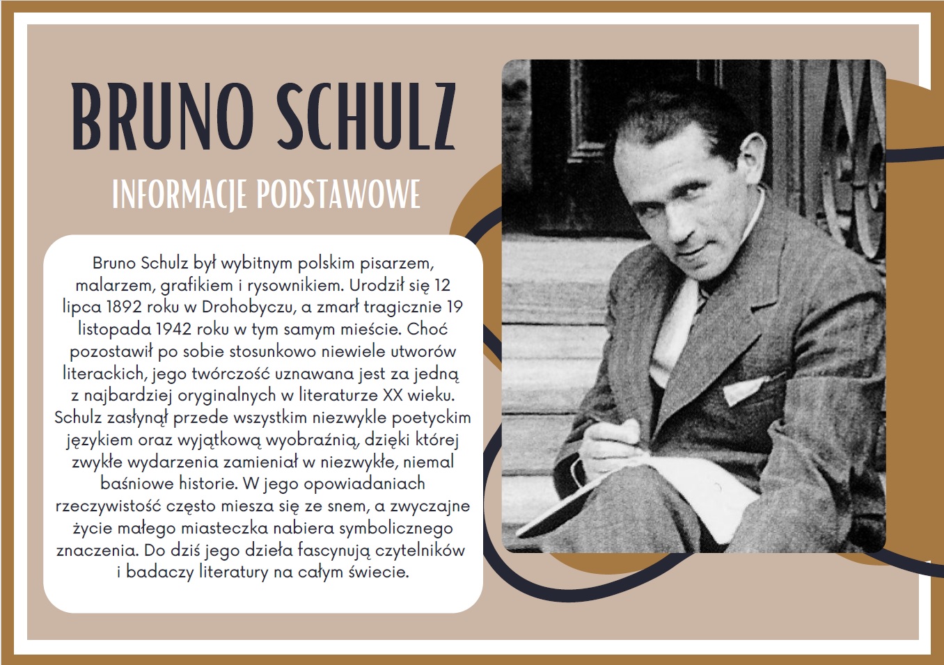 Bruno Schulz (1892–1942) był wybitnym polskim pisarzem, malarzem i grafikiem. Uznawany jest za jednego z najoryginalniejszych twórców literatury polskiej XX wieku. Jego twórczość wyróżnia się niezwykłym, poetyckim językiem oraz pełnym symboli i fantastycznych obrazów stylem.