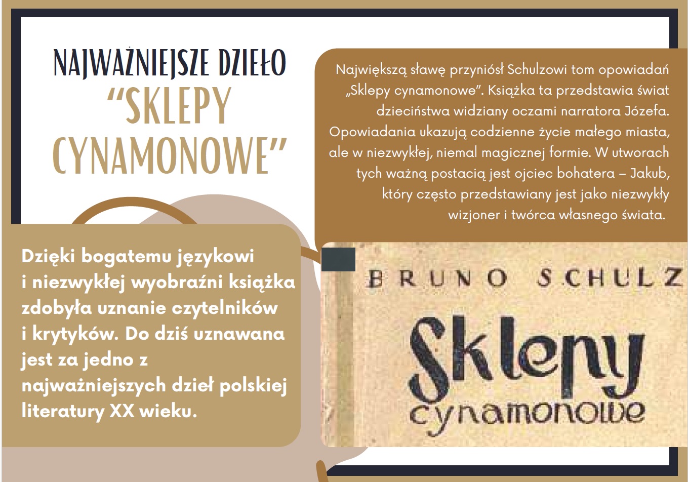 - Sklepy cynamonowe – zbiór opowiadań pełnych fantastycznych wizji dzieciństwa i niezwykłych wydarzeń,