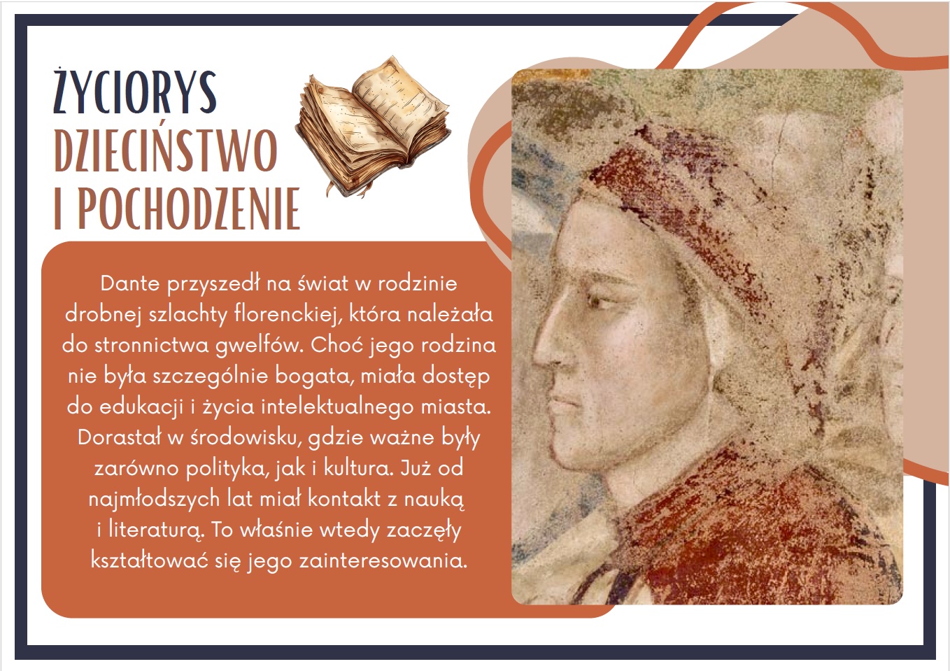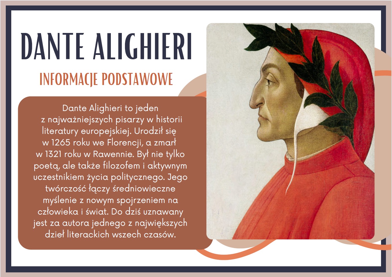 Dante Alighieri był włoskim poetą, pisarzem i myślicielem, jednym z najwybitniejszych twórców literatury światowej. Urodził się w 1265 roku we Florencji, a zmarł w 1321 roku w Rawennie. Jest uznawany za jednego z najważniejszych autorów średniowiecza.