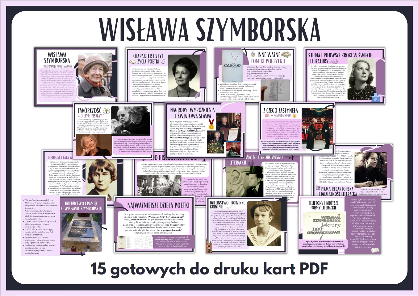 Zestaw składa się aż z 15 stron w formacie PDF, gotowych do wydruku. Plansze zawierają najważniejsze informacje o życiu poetki, ciekawostki, fragmenty twórczości oraz przejrzyste opracowanie najważniejszych faktów z jej biografii.
