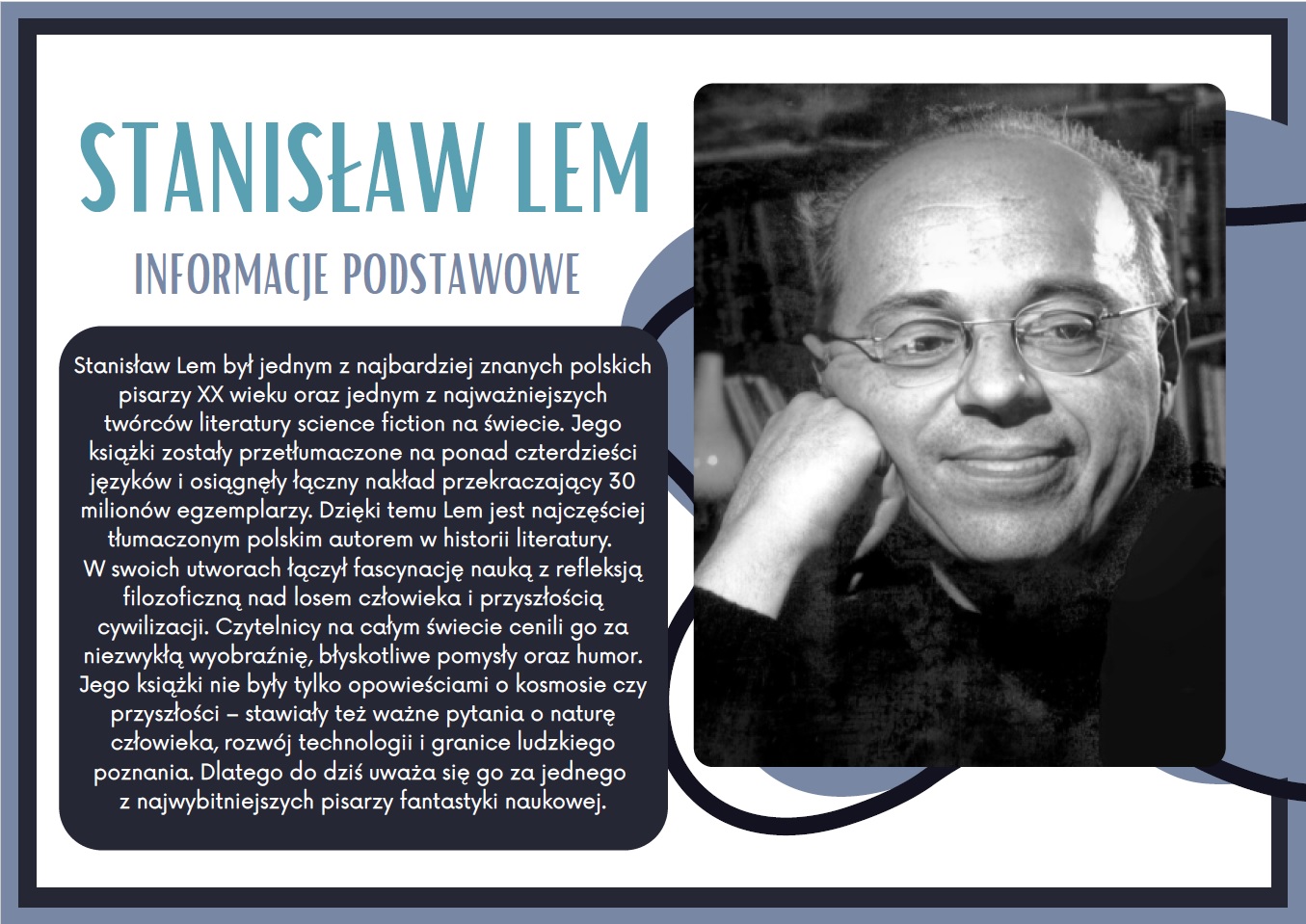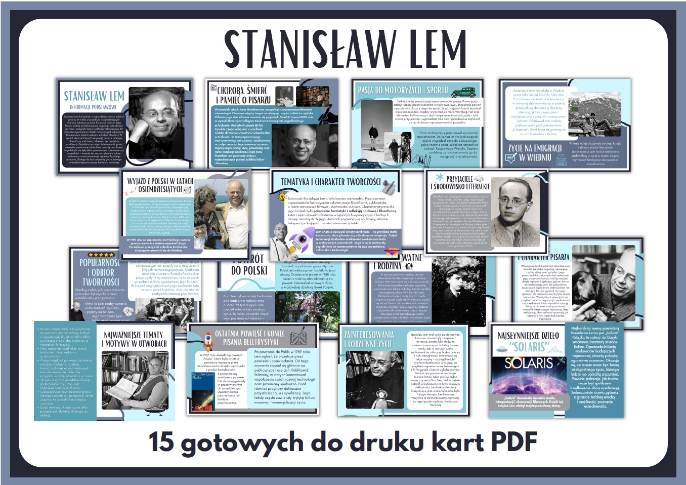 Nasz zestaw zawiera aż 15 estetycznie przygotowanych kart w formacie PDF, gotowych do wydruku. Materiały przedstawiają najważniejsze informacje z życia pisarza, ciekawostki o jego twórczości oraz najbardziej znane dzieła, takie jak Solaris, Cyberiada czy Bajki robotów.