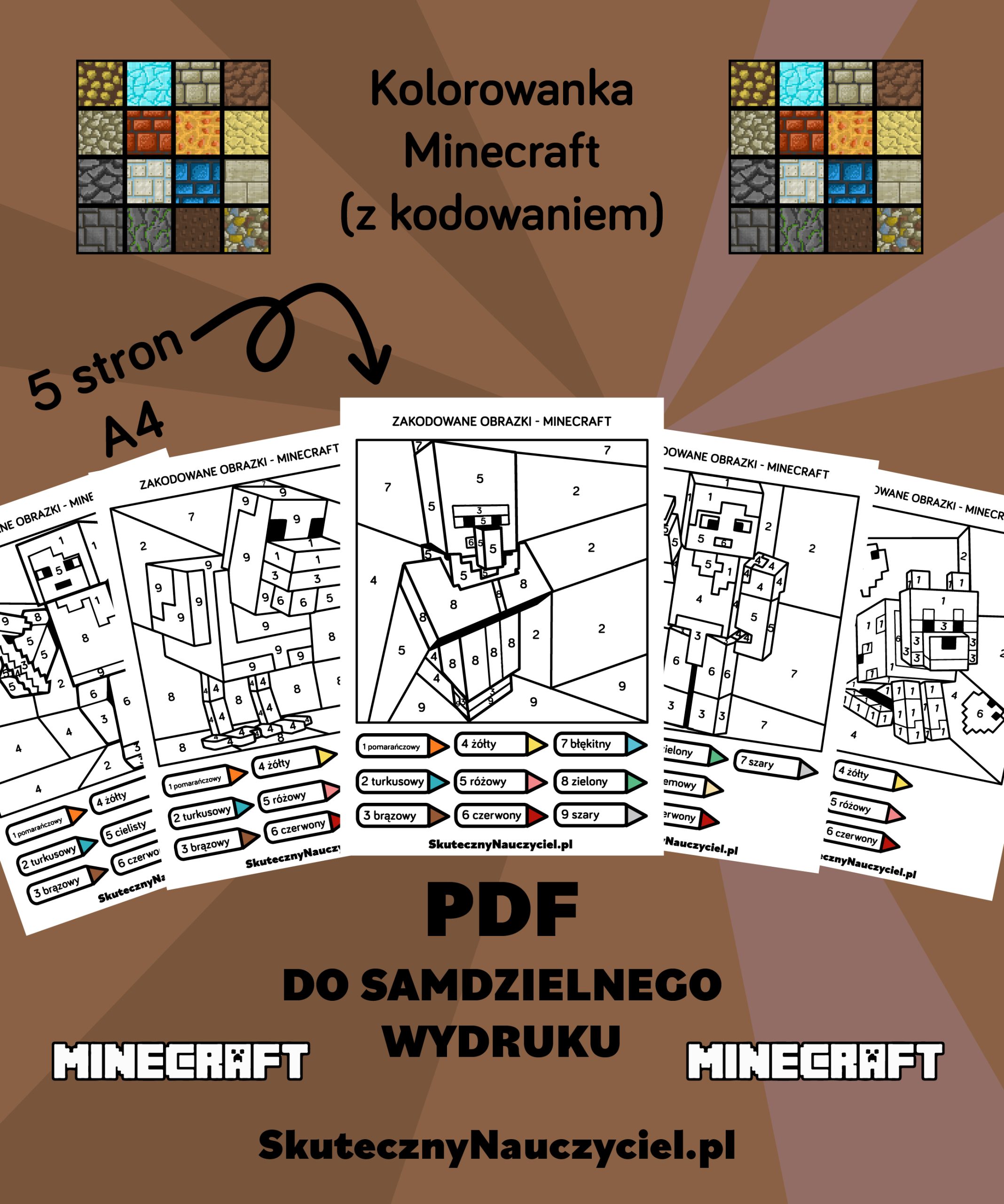 Zobacz moją najnowszą kolorowankę z kodowaniem: Minecraft – zestaw 5 stron A4 w PDF, idealny dla dzieci kochających pikselowy świat! ⛏️🟩
