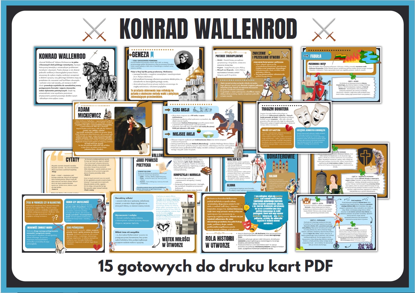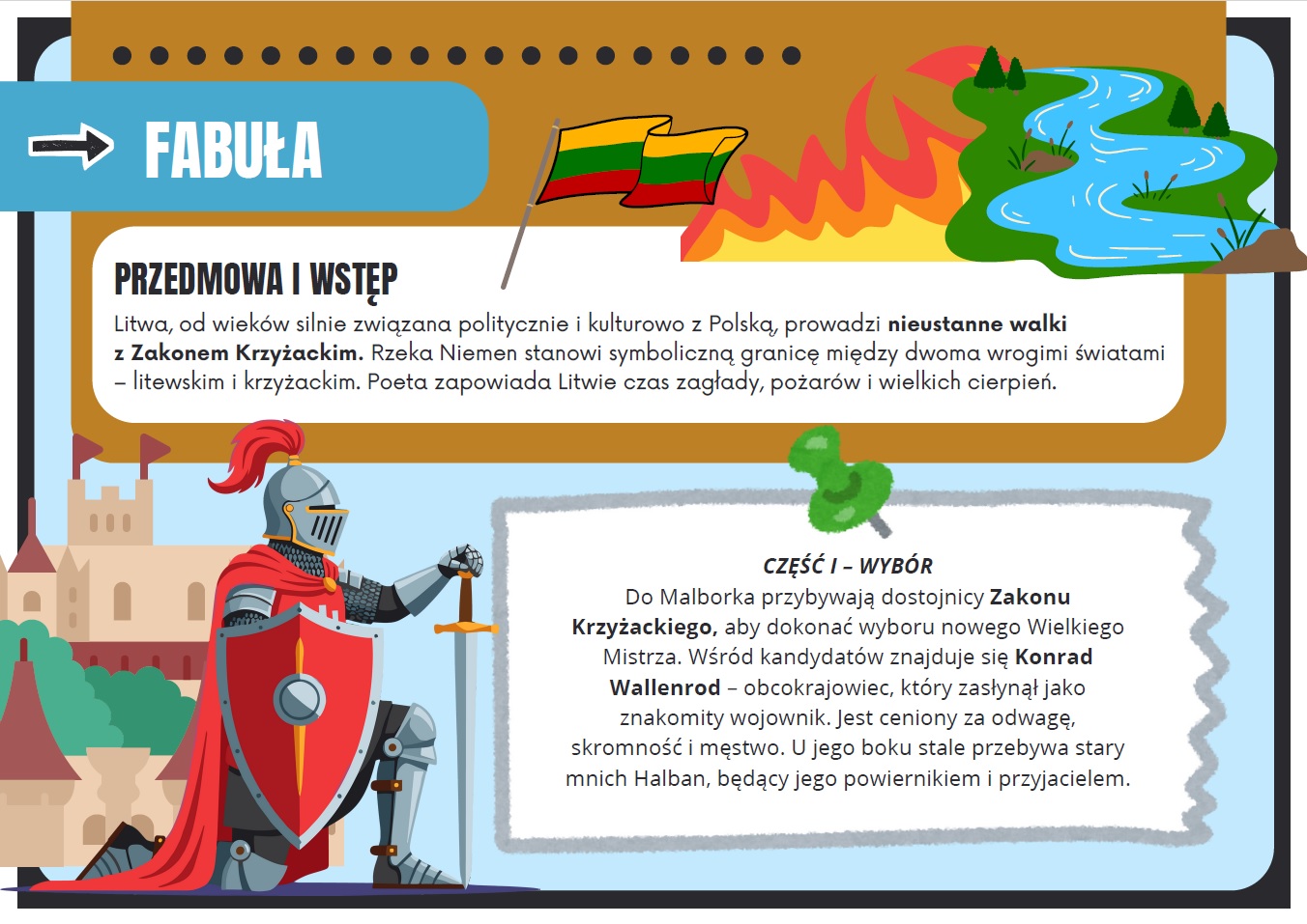 Gotowa gazetka szkolna, która w przystępny i atrakcyjny sposób przybliża uczniom jedno z najważniejszych dzieł romantyzmu autorstwa Adama Mickiewicza. Gazetka porusza temat walki o ojczyznę, patriotyzmu, zdrady i trudnych wyborów moralnych, skłaniając uczniów do refleksji i dyskusji.