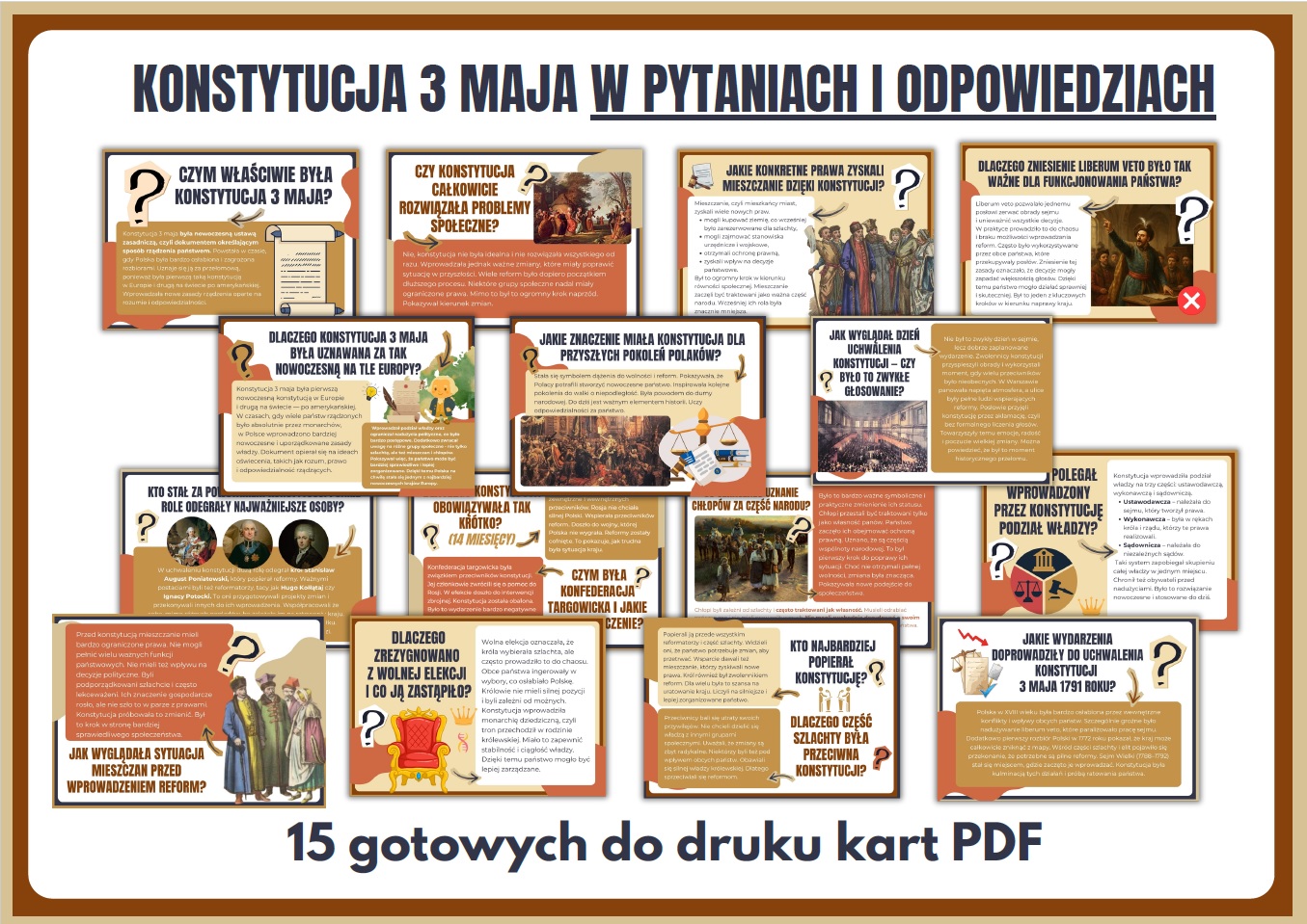 Przygotuj wyjątkową gazetkę szkolną o Konstytucji 3 Maja i pomóż uczniom lepiej zrozumieć znaczenie jednego z najważniejszych dokumentów w historii Polski. Zestaw zawiera aż 15 kart PDF, które w atrakcyjny i przejrzysty sposób wyjaśniają, czym była Konstytucja 3 Maja, dlaczego została uchwalona i jakie miała znaczenie dla państwa.
