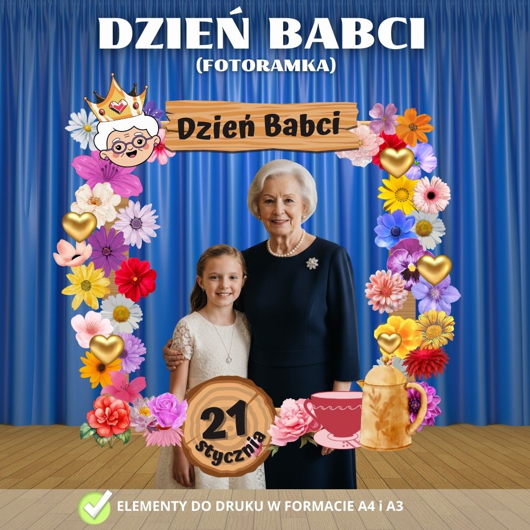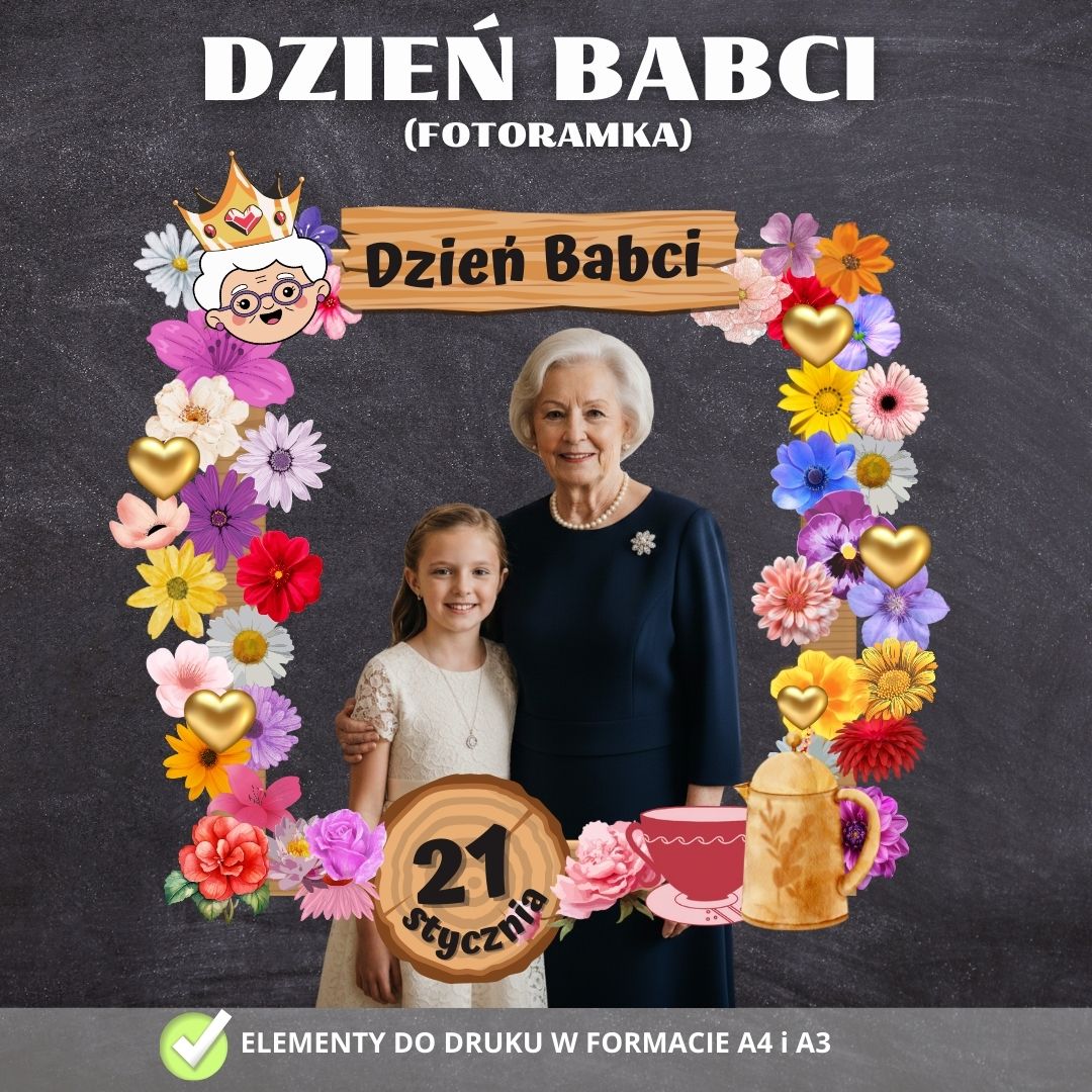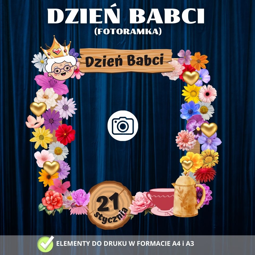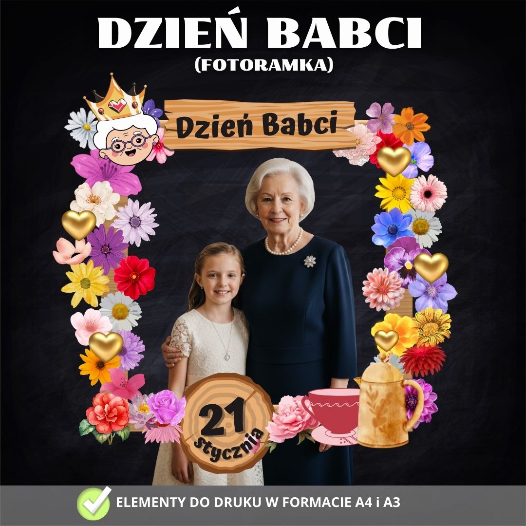 W skład zestawu wchodzi komplet elementów do wydruku (70 stron A4), umożliwiający stworzenie dekoracyjnej ramy o tematyce Święta Babci.