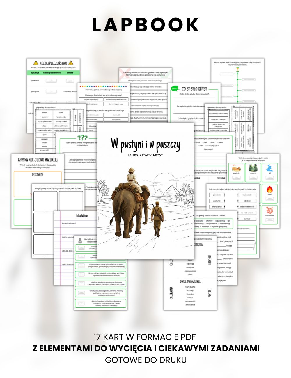 Przygotowałam kompletny lapbook „W pustyni i w puszczy” w formacie PDF (karty pracy), składający się z aż 15 bogato ilustrowanych kart, które prowadzą uczniów przez fascynującą podróż Stasia i Nel. Materiał pomaga uporządkować fabułę, poznać bohaterów, miejsca, przyrodę Afryki oraz najważniejsze wartości obecne w powieści.