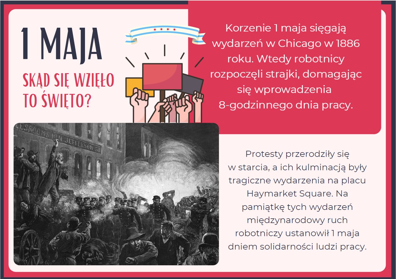 • 1 maja obchodzone jest Święto Pracy. To dzień poświęcony ludziom pracy i prawom pracowników.