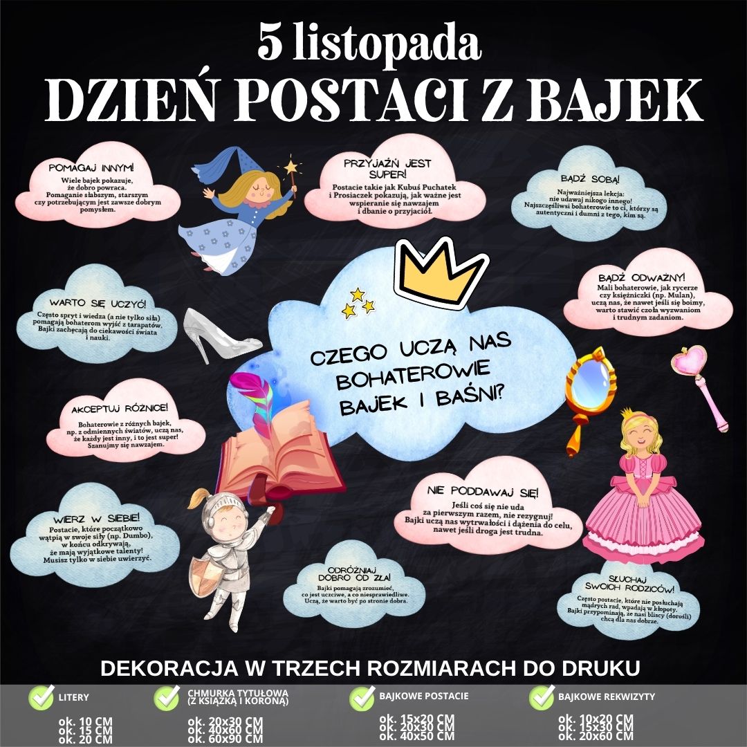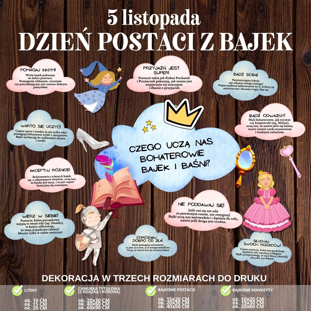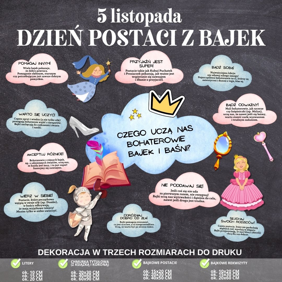 - bajkowe postacie – ok. 20 × 30 cm (każda na 1 stronie A4),
