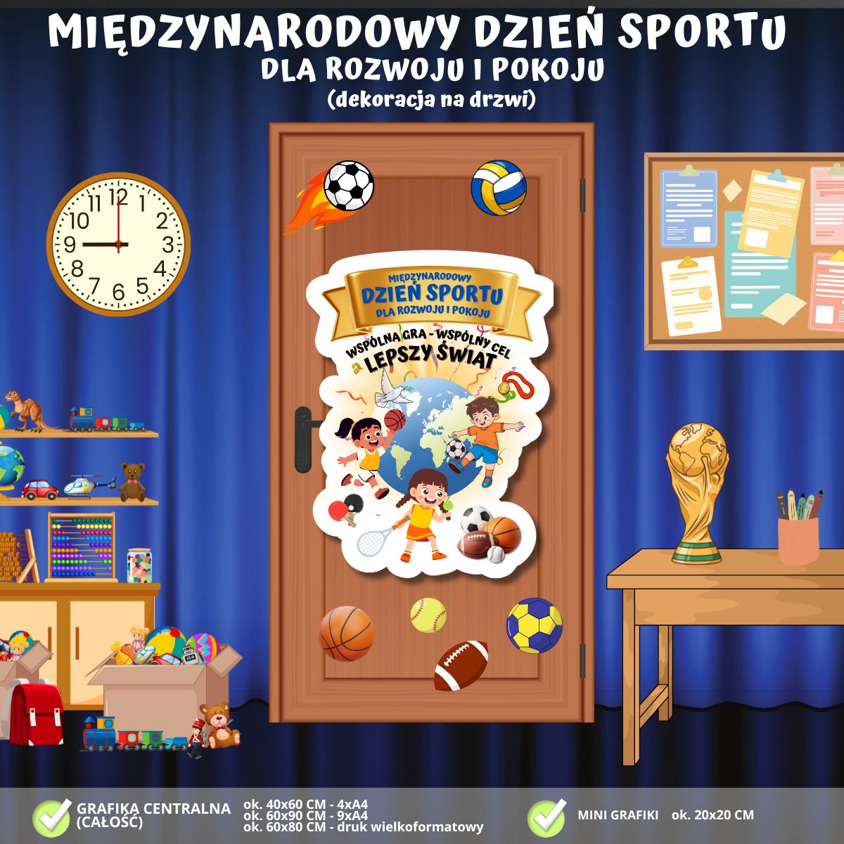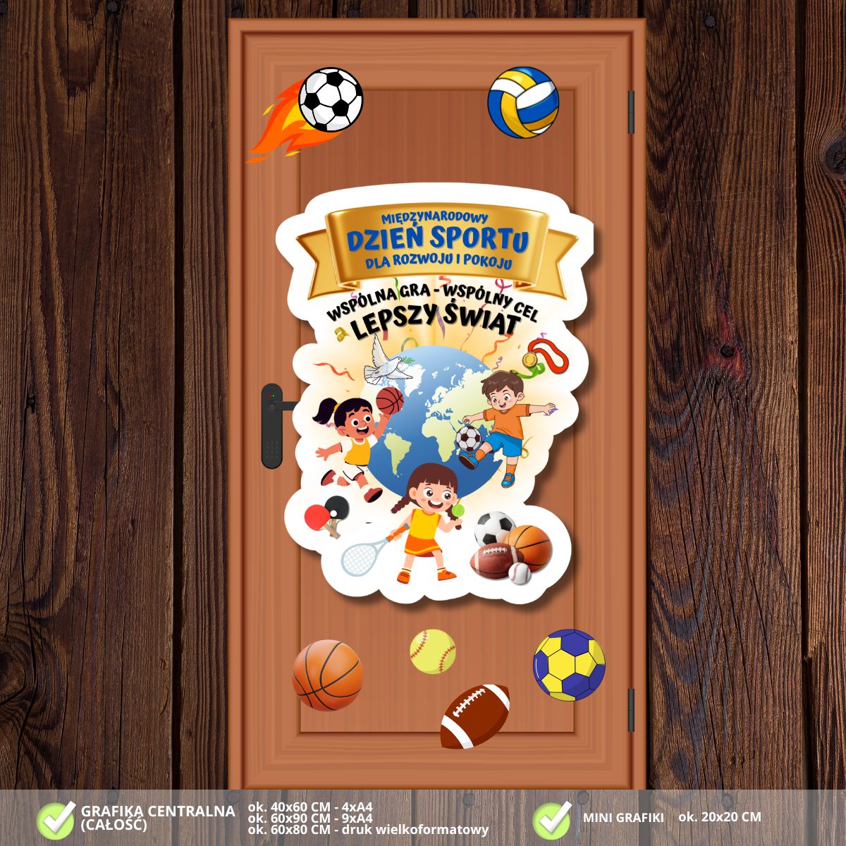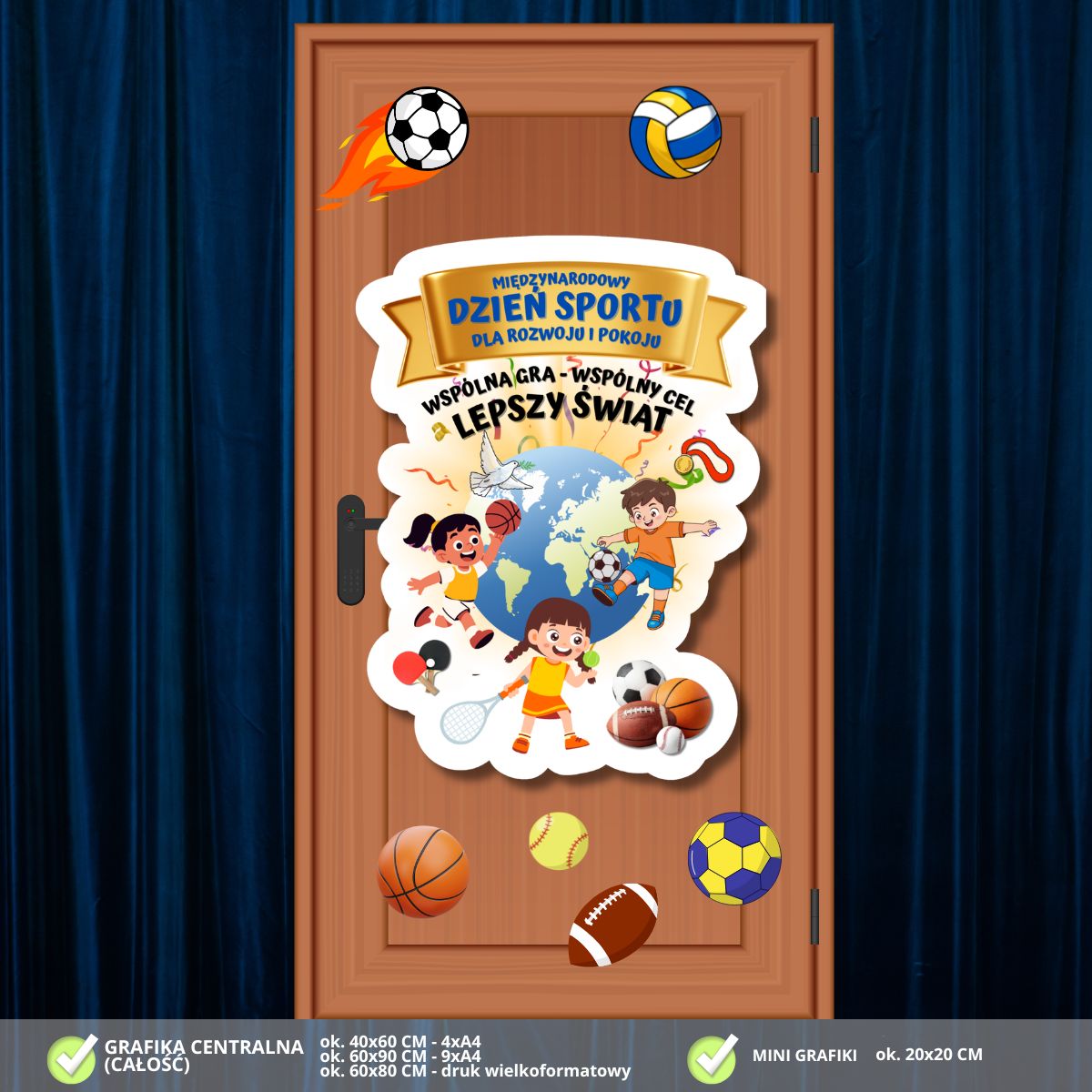 Zadbaj o wyjątkowy i motywujący wystrój w swojej klasie! Nasza najnowsza dekoracja na drzwi to połączenie sportowej pasji z edukacyjnym przesłaniem, która wprowadzi uczniów w świat aktywności fizycznej i zamieni wejście do sali w prawdziwą arenę mistrzów: