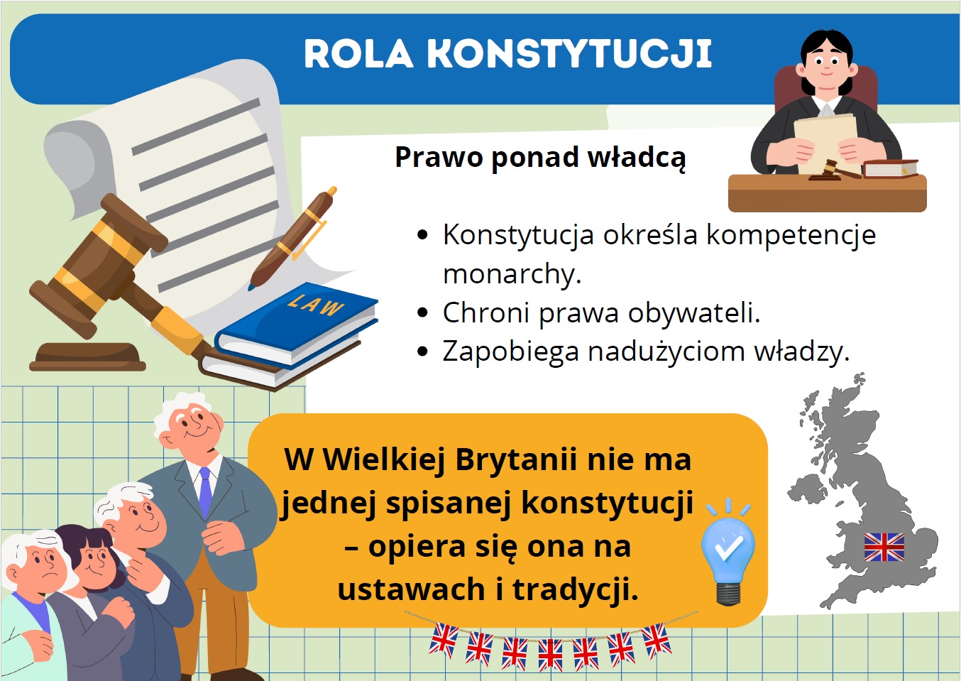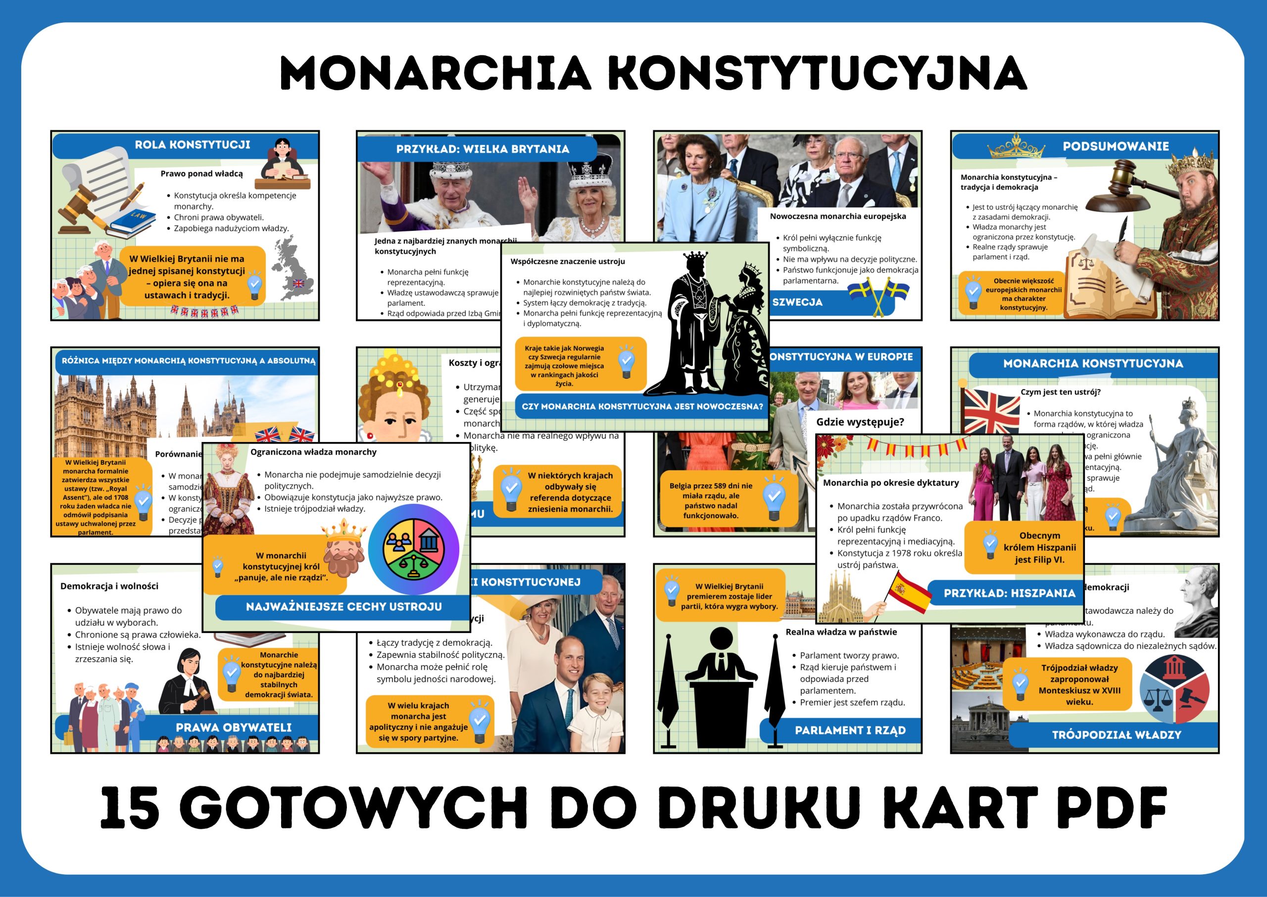 To 15 estetycznych kart PDF, które w przystępnej formie wyjaśniają, czym jest monarchia konstytucyjna, jakie są jej cechy oraz jak funkcjonuje w praktyce.