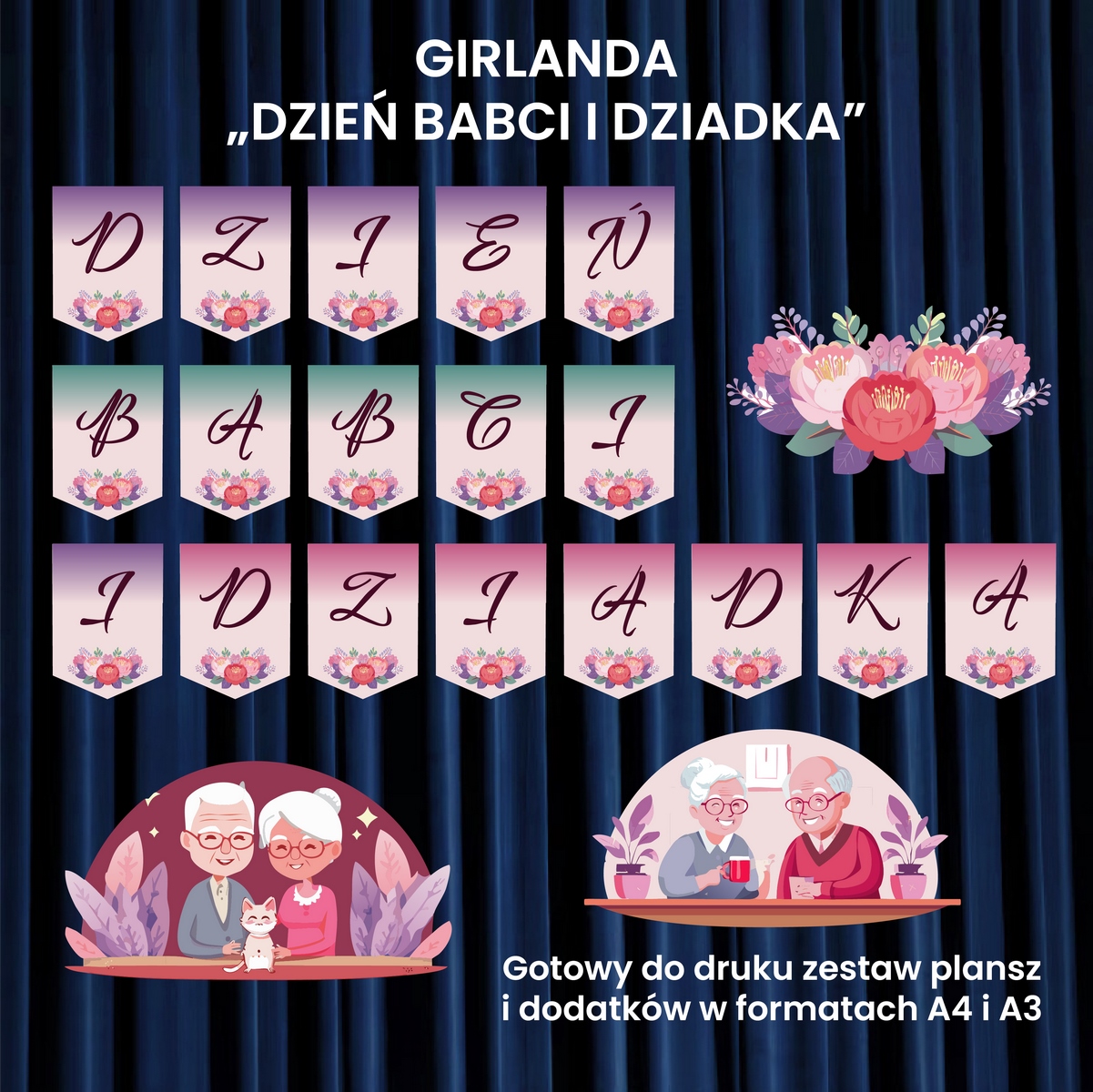 Girlanda z napisem „Dzień Babci i Dziadka” to świetna dekoracja do ozdobienia sali lekcyjnej bądź korytarza na wyjątkowe święto, które obchodzimy 21 i 22 stycznia. To właśnie wtedy dzieci z radością przygotowują występy i upominki, a piękne dekoracje tworzą wyjątkowy klimat uroczystości.