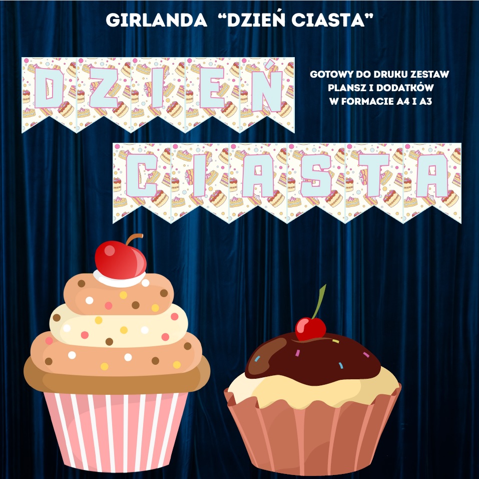 Girlanda z napisem „Dzień Ciasta” to świetna dekoracja, która sprawdzi się w sali lekcyjnej 26 listopada – w dniu, kiedy świętujemy wszystkie słodkie wypieki. To radosne i smakowite święto to idealny moment, by połączyć naukę z odrobiną zabawy.