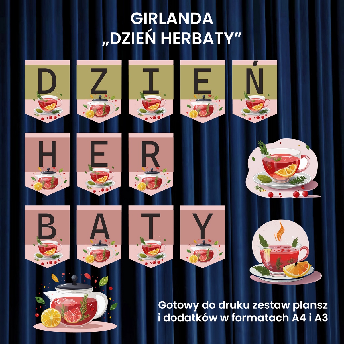 Girlanda z napisem „Dzień Herbaty” to świetna dekoracja do ozdobienia sali lekcyjnej, holu szkoły czy szkolnego korytarza z okazji Dnia Herbaty, który obchodzimy dwa razy w roku – 21 maja i 15 grudnia. To wyjątkowe święto, które zachęca do chwili zatrzymania, relaksu i rozmowy przy filiżance herbaty. Uczniowie mogą poznać ciekawostki o różnych gatunkach herbat, ich pochodzeniu i kulturze picia tego napoju na całym świecie.