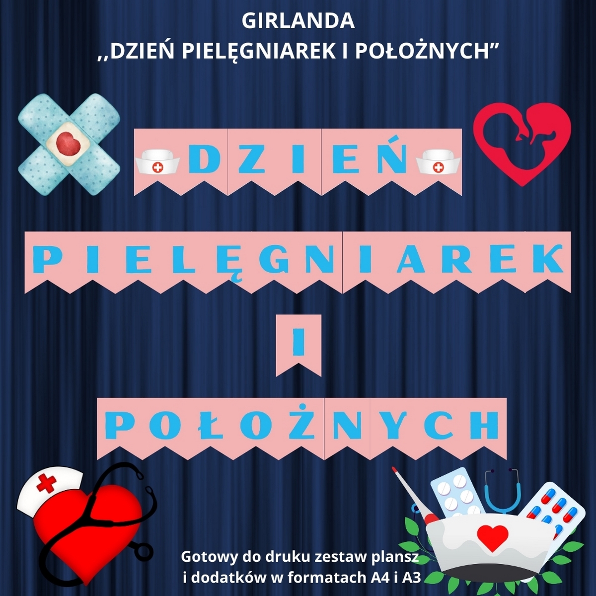 👩‍⚕️ Girlanda „Dzień Pielęgniarek i Położnych” – gotowa do druku dekoracja, która pomoże uczcić to wyjątkowe święto z klasą i sercem! Chcesz w prosty sposób stworzyć elegancką i tematyczną dekorację do szkoły, przedszkola, przychodni lub na gazetkę okolicznościową? Z tym gotowym plikiem PDF zrobisz to błyskawicznie!
