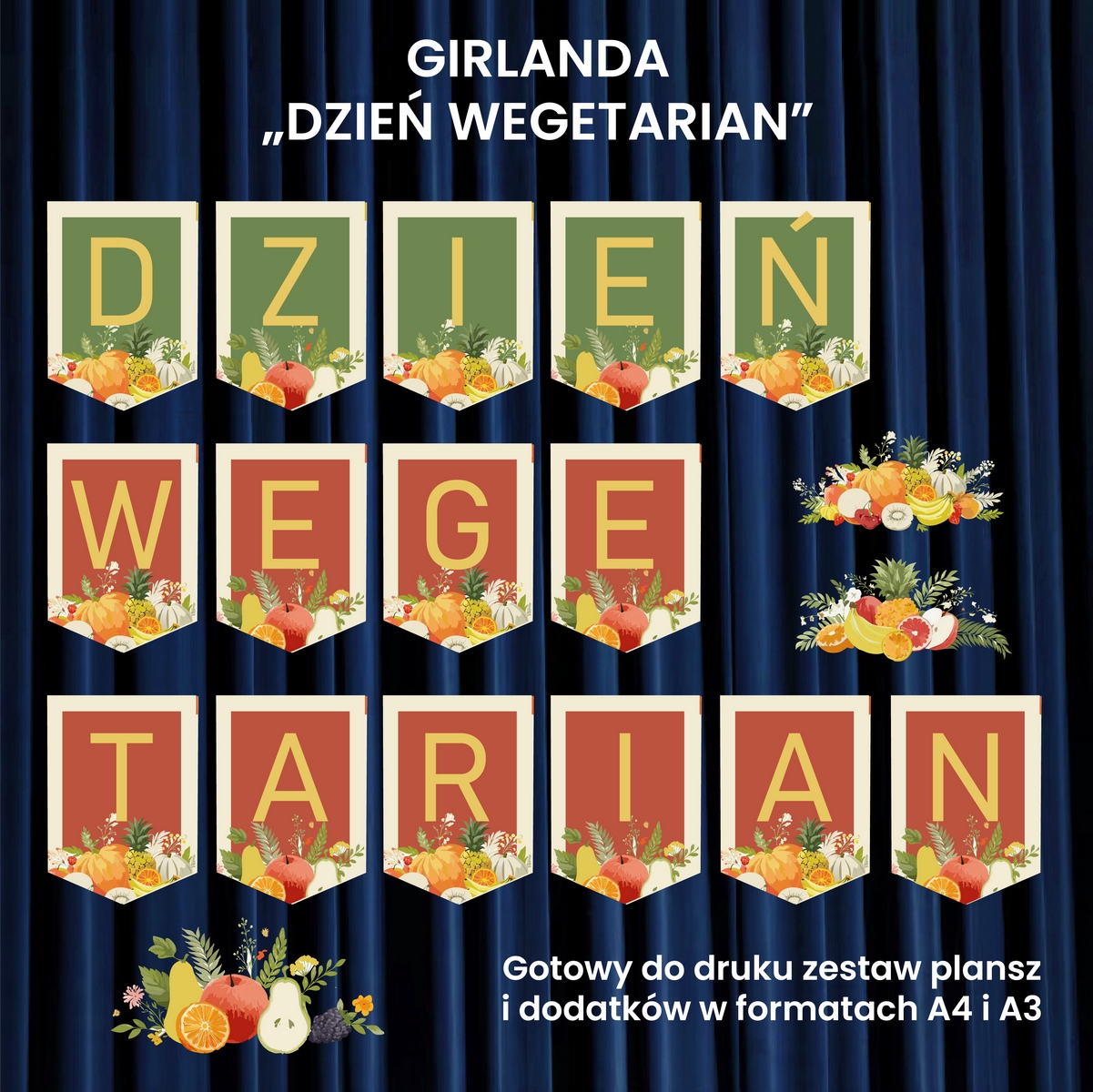Girlanda z napisem „Dzień Wegetarian” to świetna dekoracja do ozdobienia sali lekcyjnej bądź korytarza.