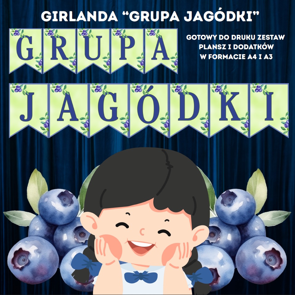 Stworzyliśmy piękną, kolorową girlandę z napisem „Grupa Jagódki”, której litery ozdobione są uroczymi grafikami nawiązującymi do jagód. Całość jest spójna, estetyczna i przyciąga wzrok – będzie wspaniałym elementem wystroju w każdej sali.