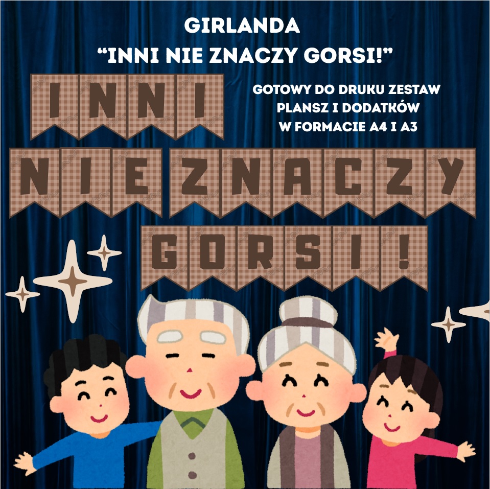 Girlanda „Inni nie znaczy gorsi!” została przygotowana w formie pliku PDF, gotowego do wydruku natychmiast po zakupie. Otrzymasz litery w dwóch rozmiarach – A4 i A3 – co pozwoli Ci dopasować napis do każdej przestrzeni. Do kompletu dołączone są także kolorowe grafiki, które sprawiają, że dekoracja prezentuje się atrakcyjnie i podkreśla swoje przesłanie.