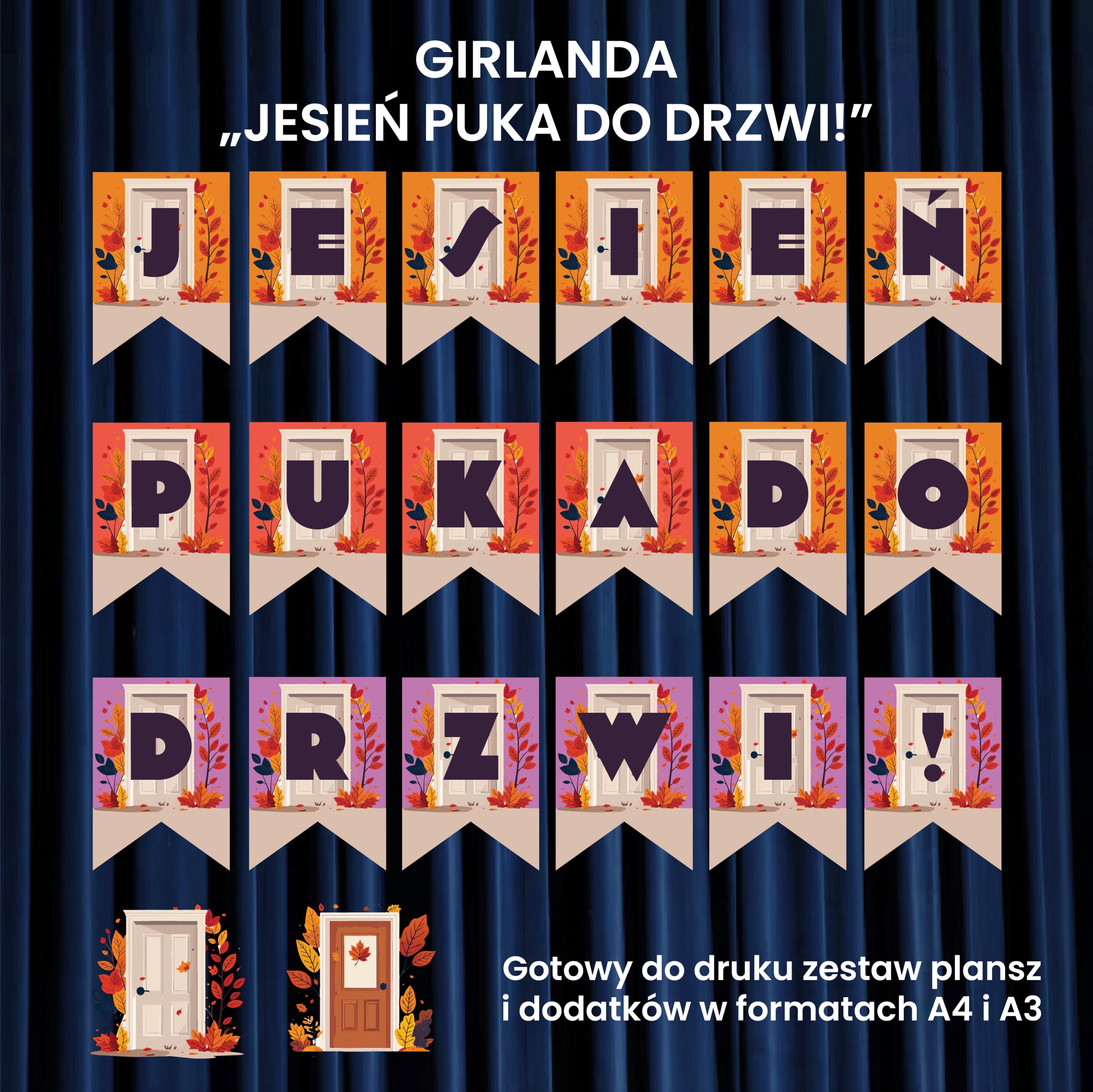 Podkreśl nadejście jesieni w swojej sali dzięki dekoracyjnemu napisowi „Jesień puka do drzwi!”. Materiał zapisany w formacie PDF i dostępny w dwóch rozmiarach do druku – A4 oraz A3 doskonale sprawdzi się na tablicy, gazetce szkolnej lub w kąciku tematycznym.