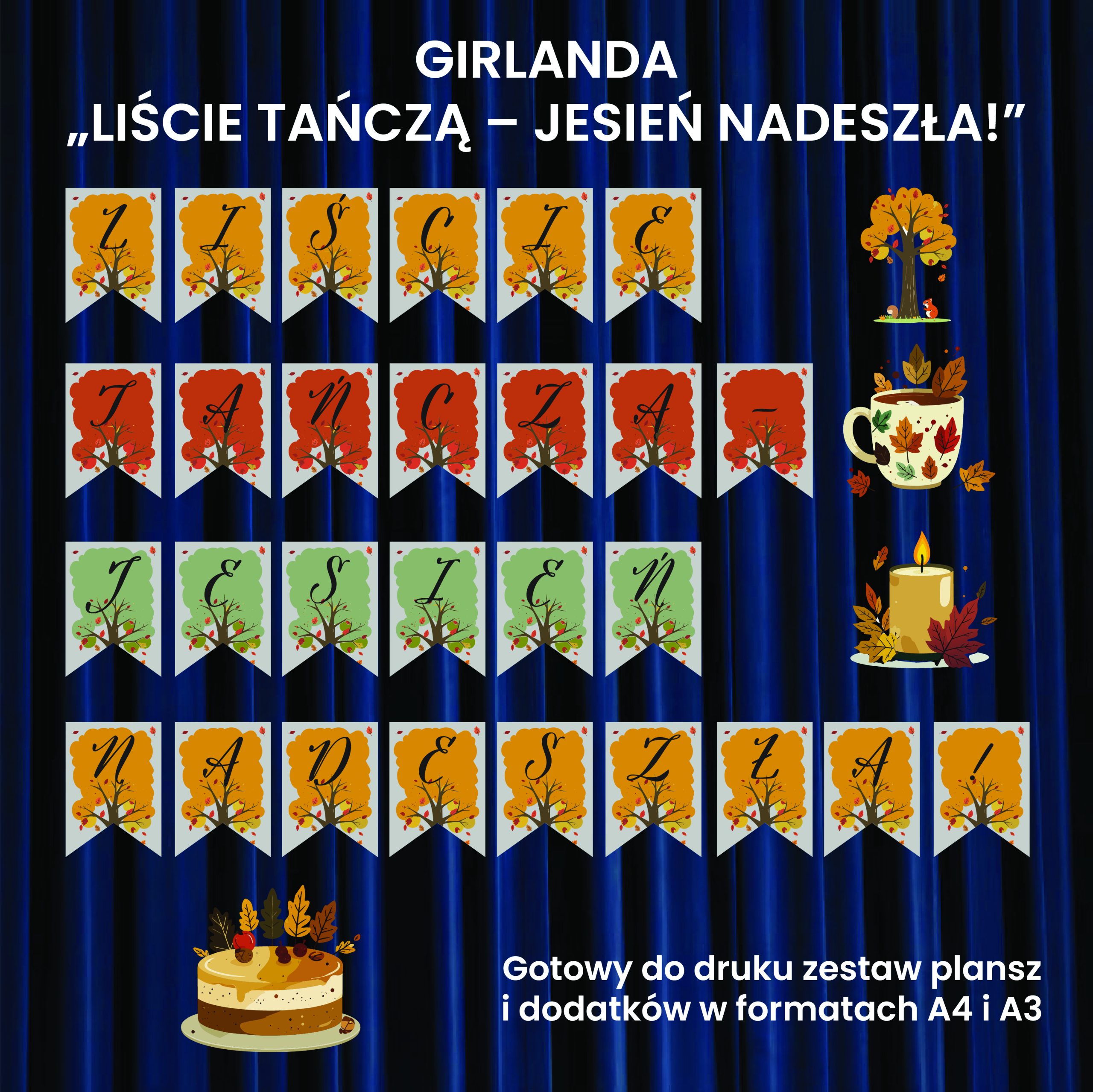Dodaj swojej sali edukacyjnej koloru i lekkości dzięki dekoracyjnemu napisowi „Liście tańczą – jesień nadeszła!”. Materiał zapisany w formacie PDF i dostępny w dwóch rozmiarach do druku – A4 oraz A3 sprawdzi się zarówno w mniejszych, jak i większych aranżacjach.
