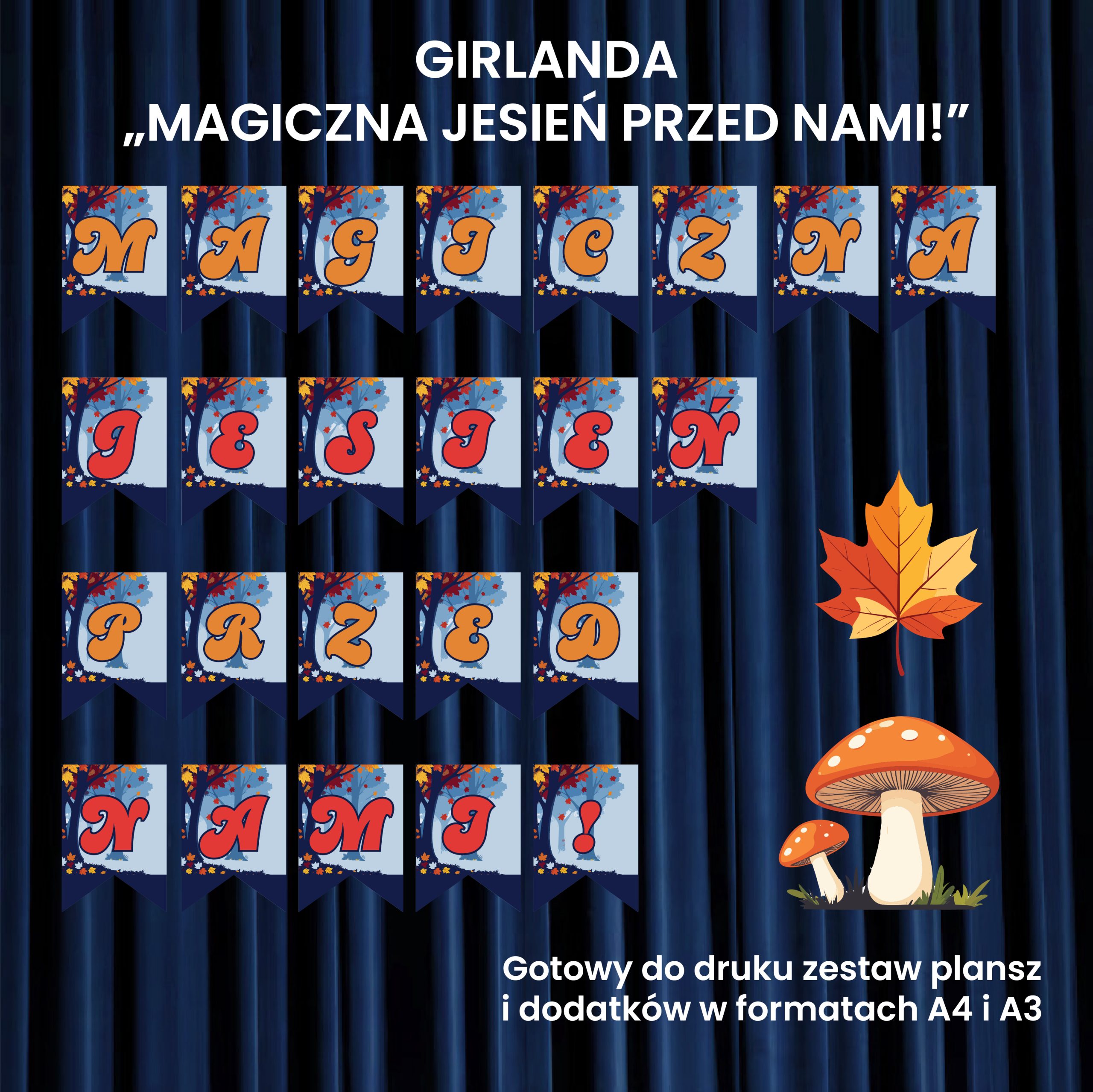 Podkreśl urok nadchodzącej pory roku dzięki dekoracyjnemu napisowi „Magiczna jesień przed nami”. Materiał dostępny w formacie PDF i w dwóch rozmiarach do druku – A4 oraz A3 świetnie sprawdzi się na tablicy, gazetce szkolnej lub w jesiennym kąciku tematycznym.