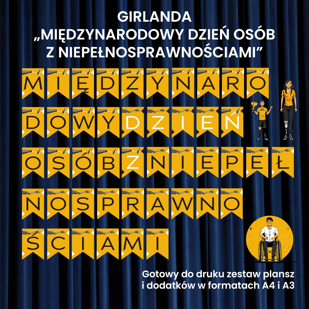 Napis „Międzynarodowy Dzień Osób z Niepełnosprawnościami” przygotowany jest w pliku PDF, dzięki czemu możesz go wydrukować od razu po zakupie. Otrzymasz dwa rozmiary liter – A3 i A4 – co pozwoli idealnie dopasować girlandę do dostępnej przestrzeni. Całość uzupełniają tematyczne ilustracje, które dodadzą dekoracji estetyki i uroku.