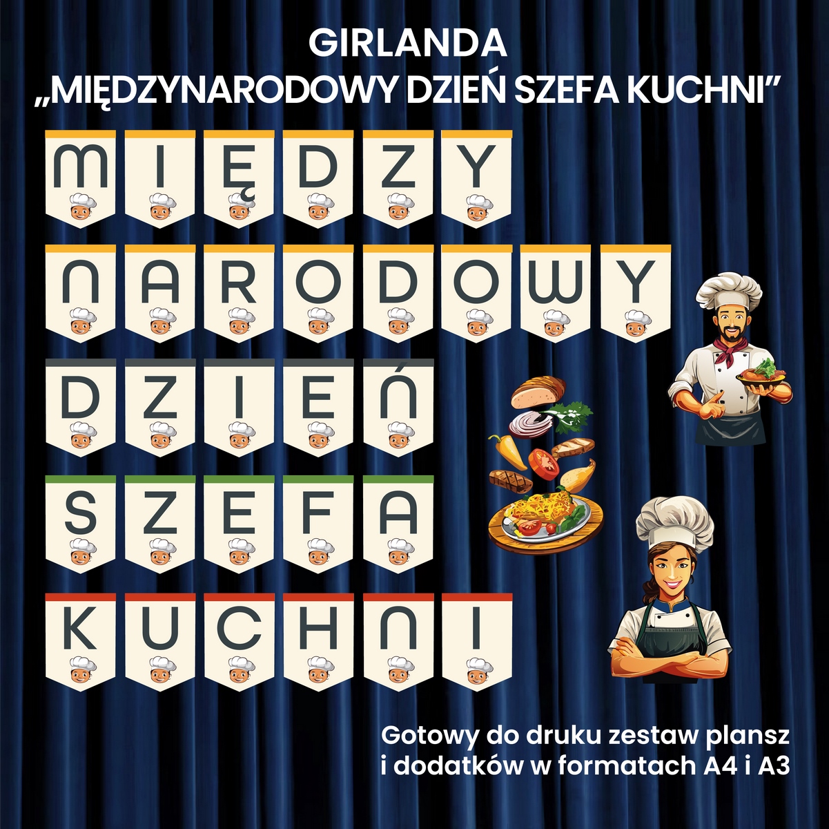 Kolorowa girlanda „Międzynarodowy Dzień Szefa Kuchni” została zaprojektowana tak, by łączyć estetykę z praktycznym zastosowaniem. Wyraziste litery w towarzystwie tematycznych grafik przedstawiających elementy kuchni tworzą harmonijną i efektowną całość. Plik PDF w dwóch rozmiarach liter można wydrukować wielokrotnie, a po zalaminowaniu będzie służyć przez wiele kolejnych lat.