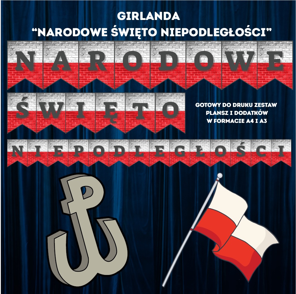 Nasz zestaw tematycznych grafik oraz napis: „Narodowe Święto Niepodległości” został przygotowany w formacie PDF, gotowym do pobrania i druku natychmiast po zakupie. W zestawie znajdują się litery w dwóch rozmiarach – A3 i A4 – które można łatwo dopasować do przestrzeni sali, korytarza lub szkolnej gazetki. Oprócz liter otrzymasz również tematyczne grafiki w biało-czerwonych barwach, które idealnie podkreślą charakter święta. Girlandę można drukować wielokrotnie, a po zalaminowaniu posłuży przez wiele lat, zachowując swój piękny wygląd.
