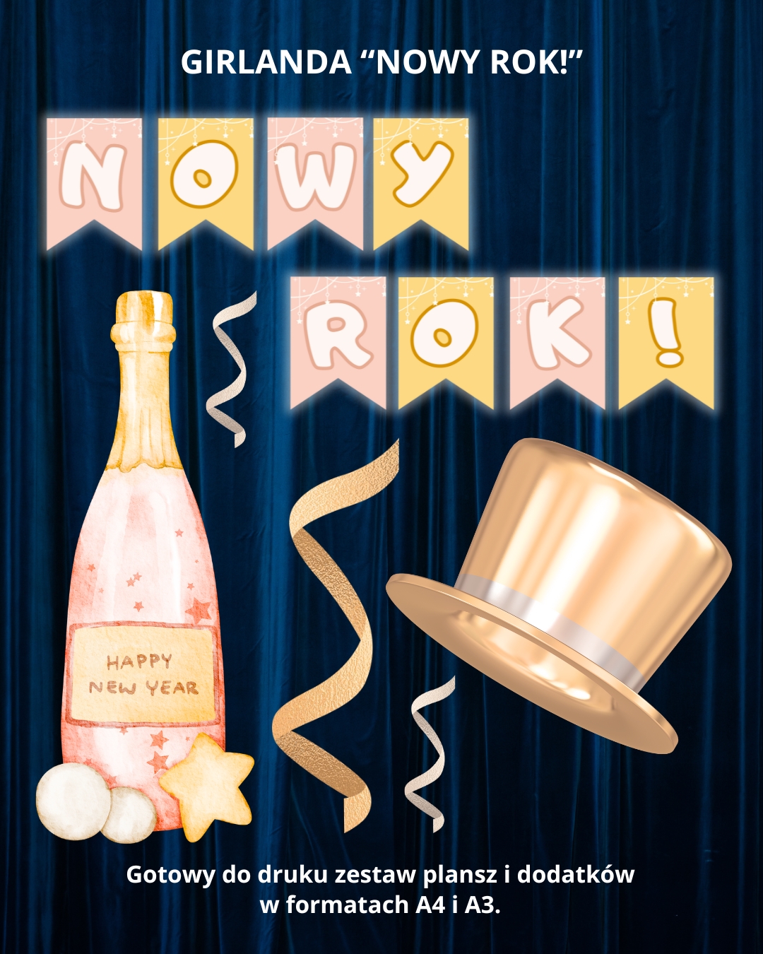 Girlanda „Nowy Rok” przygotowana jest w formie pliku PDF, gotowego do pobrania i wydruku zaraz po zakupie. W zestawie znajdują się litery w dwóch rozmiarach – A4 i A3 – które pozwolą dopasować napis do dowolnej przestrzeni. Dopełnieniem całości są kolorowe, tematyczne grafiki, które dodają uroku i podkreślają noworoczny klimat.