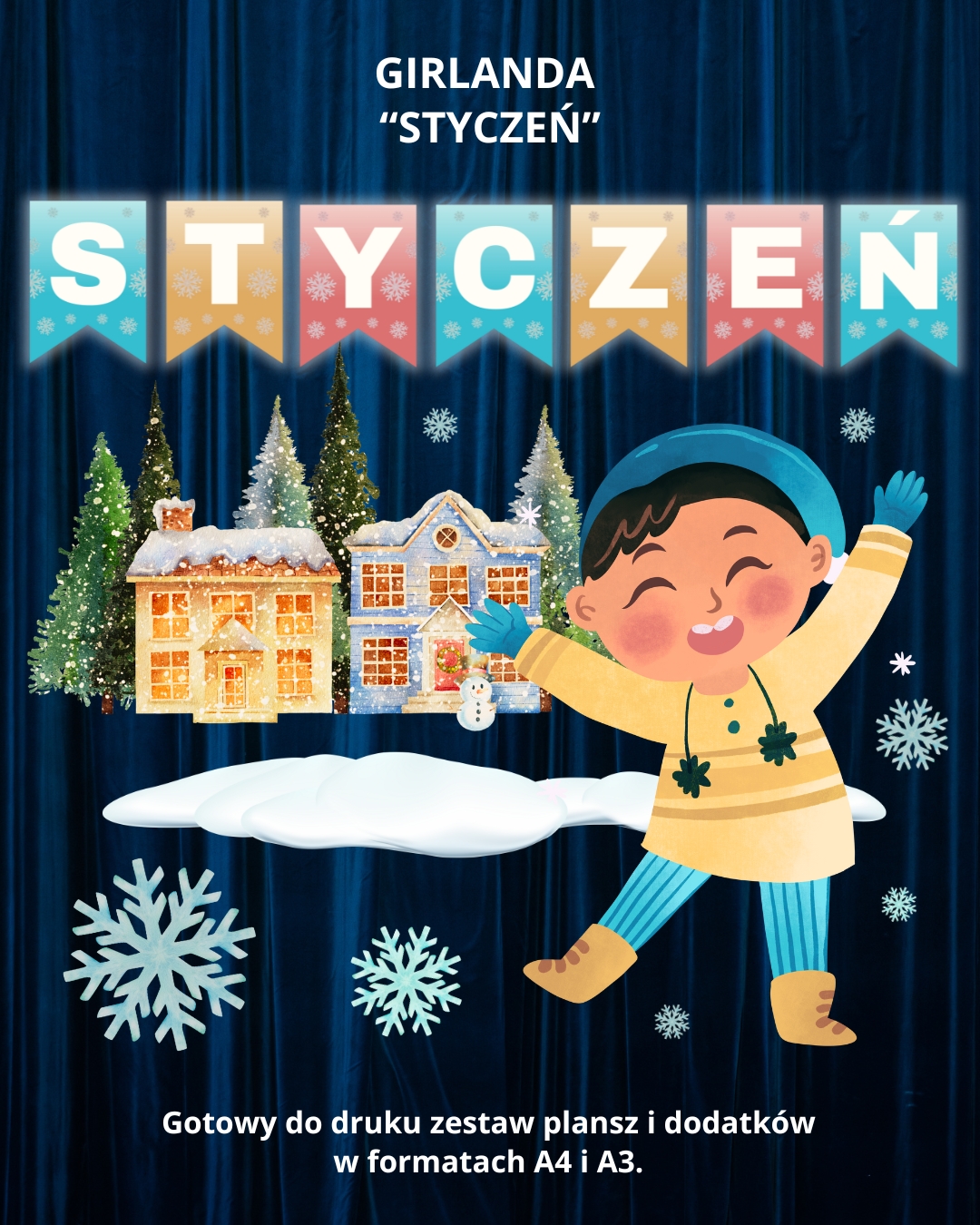 Girlanda z napisem „Styczeń” to piękna dekoracja, która doskonale ozdobi salę lekcyjną lub przedszkolną, wprowadzając do niej zimową atmosferę i świeży początek nowego roku. Śnieżynki, lodowe kolory i radosny charakter liter sprawią, że wnętrze nabierze przytulnego, a jednocześnie pełnego energii klimatu. To idealny akcent, który umili dzieciom codzienne zajęcia w zimowe dni.