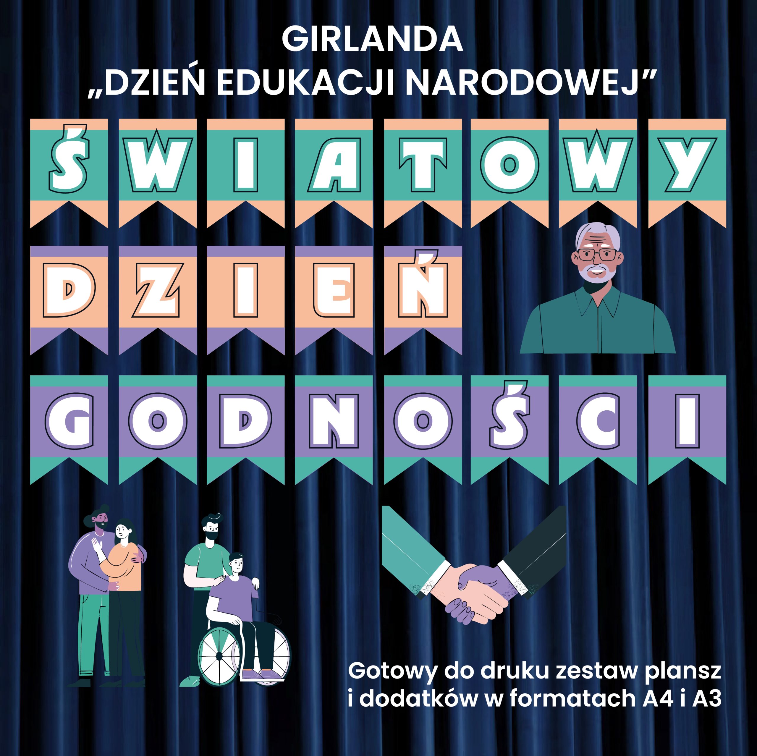 Przygotowaliśmy piękną i kolorową girlandę „Światowy Dzień Godności”, która łączy wyraziste litery z dopasowanymi grafikami symbolizującymi godność, współpracę i troskę o innych. Otrzymujesz gotowy do druku plik PDF, dzięki któremu przygotowanie dekoracji zajmuje dosłownie chwilę – a efekt wizualny na pewno zrobi wrażenie na uczniach.