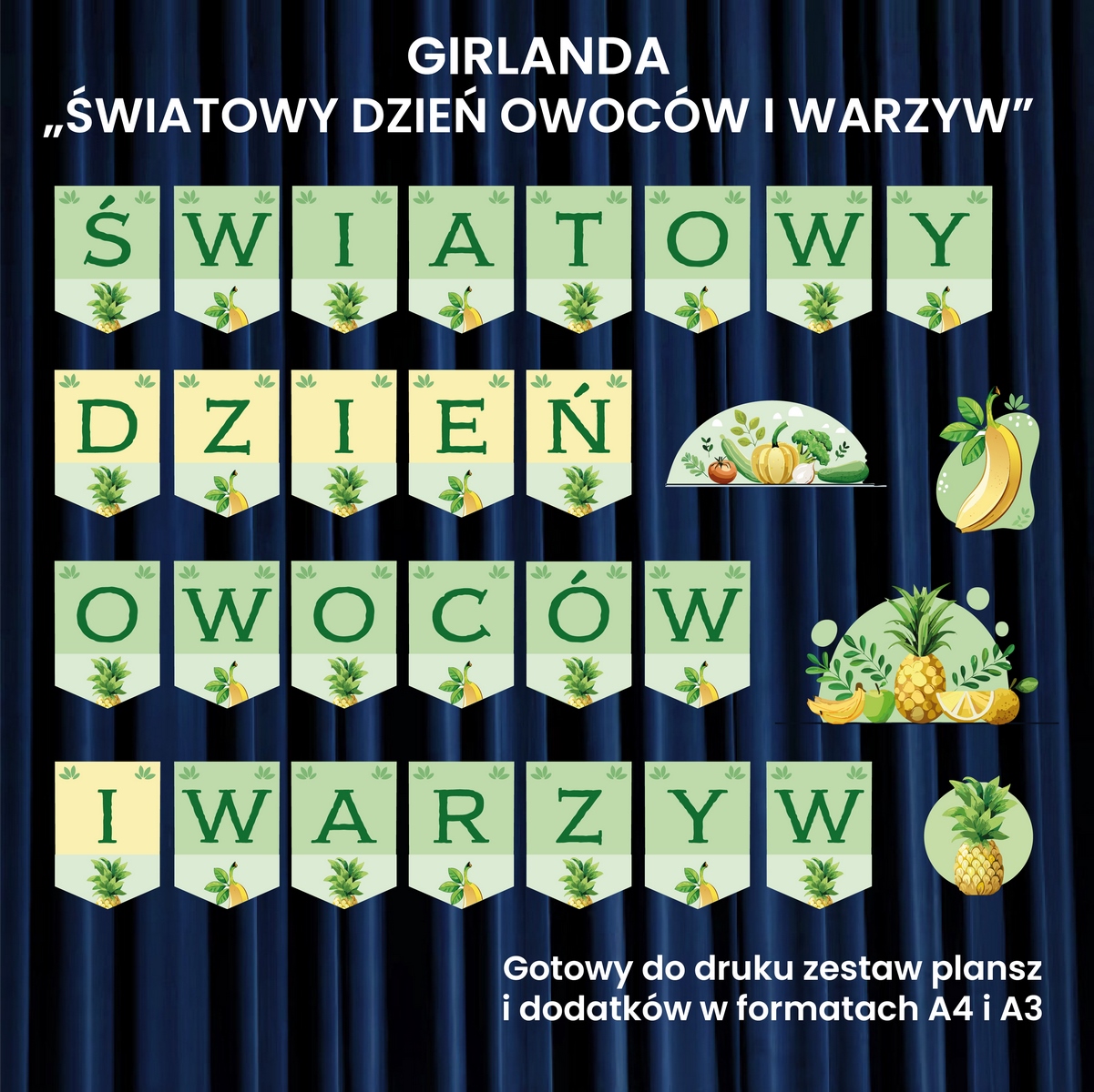 Stworzyliśmy kolorowy, przyciągający wzrok zestaw liter z napisem „Światowy Dzień Owoców i Warzyw”, wzbogacony o piękne grafiki tematyczne, które ożywią każdą przestrzeń edukacyjną. Girlanda idealnie sprawdzi się w klasie, na szkolnym korytarzu czy jako tło do zdjęć podczas wydarzenia.