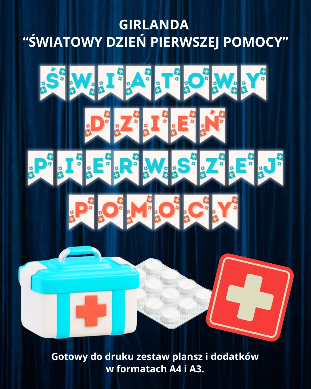 Girlanda z napisem „Światowy Dzień Pierwszej Pomocy” to świetna dekoracja do ozdobienia sali lekcyjnej bądź korytarza podczas obchodów tego wyjątkowego dnia, który co roku przypada w drugą sobotę września.