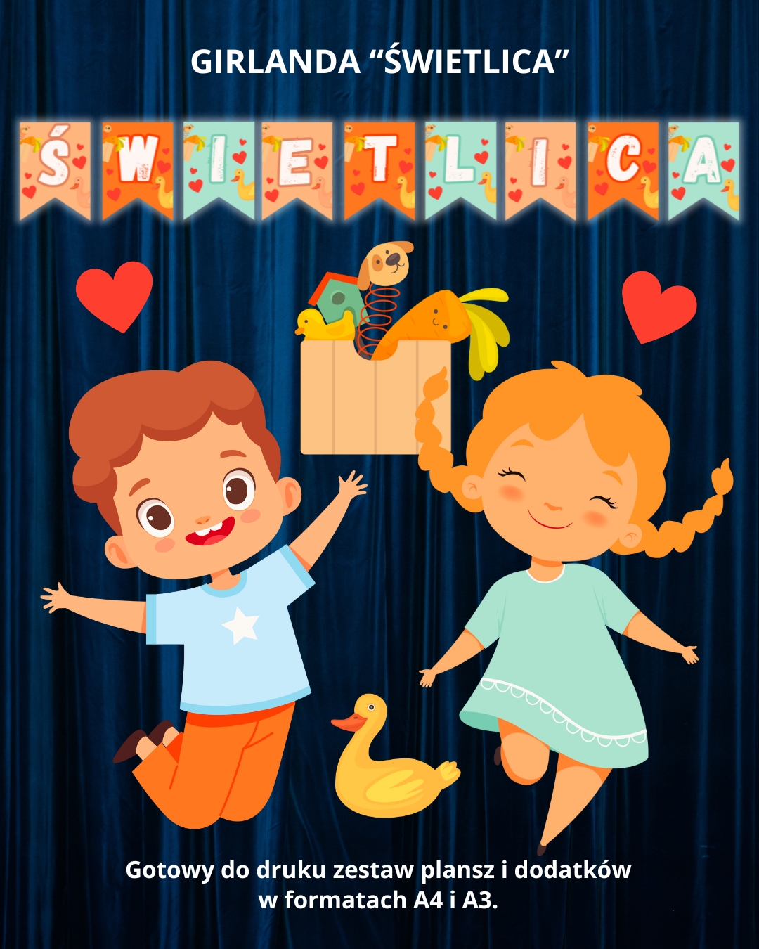 Girlanda „Świetlica” przygotowana została w formie pliku PDF, który możesz od razu pobrać i wydrukować. W zestawie znajdziesz litery w dwóch rozmiarach – A4 i A3 – oraz dodatkowe grafiki, które sprawiają, że dekoracja prezentuje się wyjątkowo atrakcyjnie. Napis możesz wykorzystać wielokrotnie, a po zalaminowaniu będzie służył przez kolejne lata.