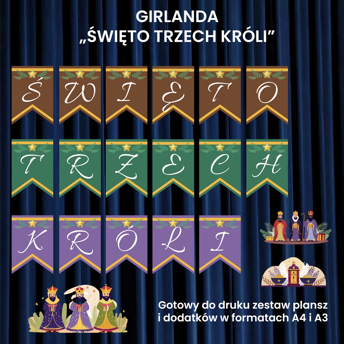 Girlanda „Święto Trzech Króli” przygotowana została w formie pliku PDF, który możesz pobrać i wydrukować od razu po zakupie. W zestawie znajdziesz litery w dwóch rozmiarach – A4 i A3 – co pozwoli Ci dopasować napis do przestrzeni sali. Całość uzupełniają piękne, tematyczne grafiki, które podkreślą wyjątkowy charakter uroczystości.