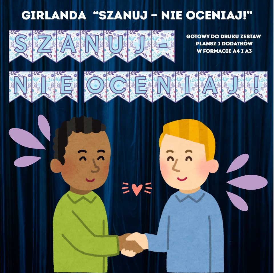 Girlanda z napisem „Szanuj – nie oceniaj!” to świetna dekoracja do ozdobienia sali lekcyjnej bądź korytarza na okazję Międzynarodowego Dnia Tolerancji, który obchodzimy 16 listopada.