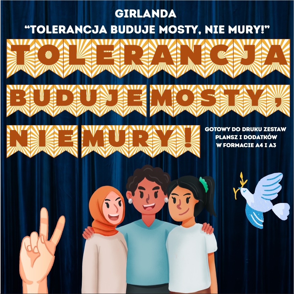 Girlanda z napisem „Tolerancja buduje mosty, nie mury!” to świetna dekoracja do ozdobienia sali lekcyjnej lub przedszkolnej z okazji Międzynarodowego Dnia Tolerancji, który obchodzimy 16 listopada. To hasło doskonale podkreśla wartość współpracy, akceptacji i wzajemnego szacunku – bez względu na to, czym się różnimy. 💙🌍