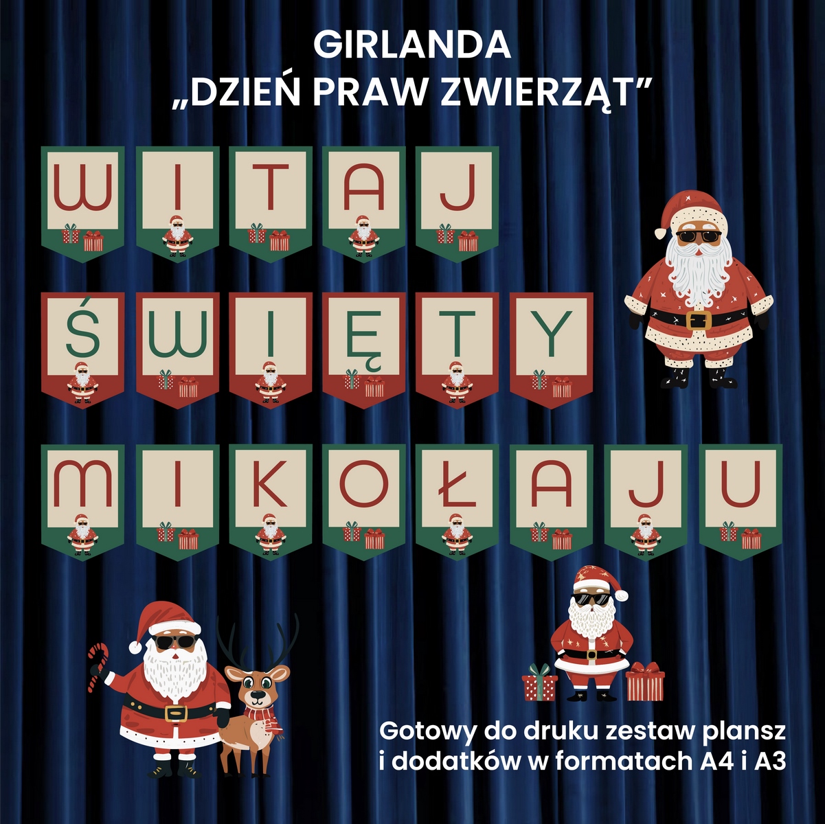 Nasz zestaw tematycznych grafik oraz napis: „Witaj Święty Mikołaju” przygotowaliśmy w formie pliku PDF, który możesz pobrać i wydrukować od razu po zakupie. W komplecie otrzymasz litery w dwóch rozmiarach – A3 i A4 – które możesz dowolnie ze sobą łączyć. Do zestawu dołączone są także piękne świąteczne grafiki, które podkreślą wyjątkowy charakter dekoracji. Dzięki możliwości wielokrotnego druku i laminacji girlanda posłuży Ci przez kolejne lata.