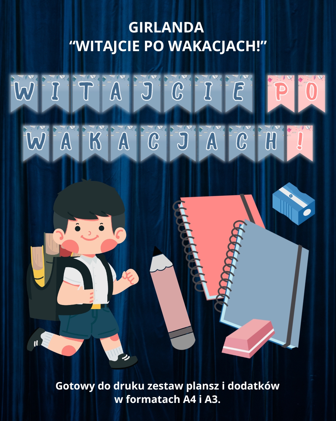 Girlanda „Witajcie po wakacjach!” dostępna jest w formie gotowego pliku PDF, który możesz od razu wydrukować. Otrzymujesz dwa rozmiary liter – A4 i A3 – co pozwala dopasować napis do wielkości sali. Całość uzupełniają piękne, tematyczne grafiki, które dodają dekoracji wyjątkowego uroku.